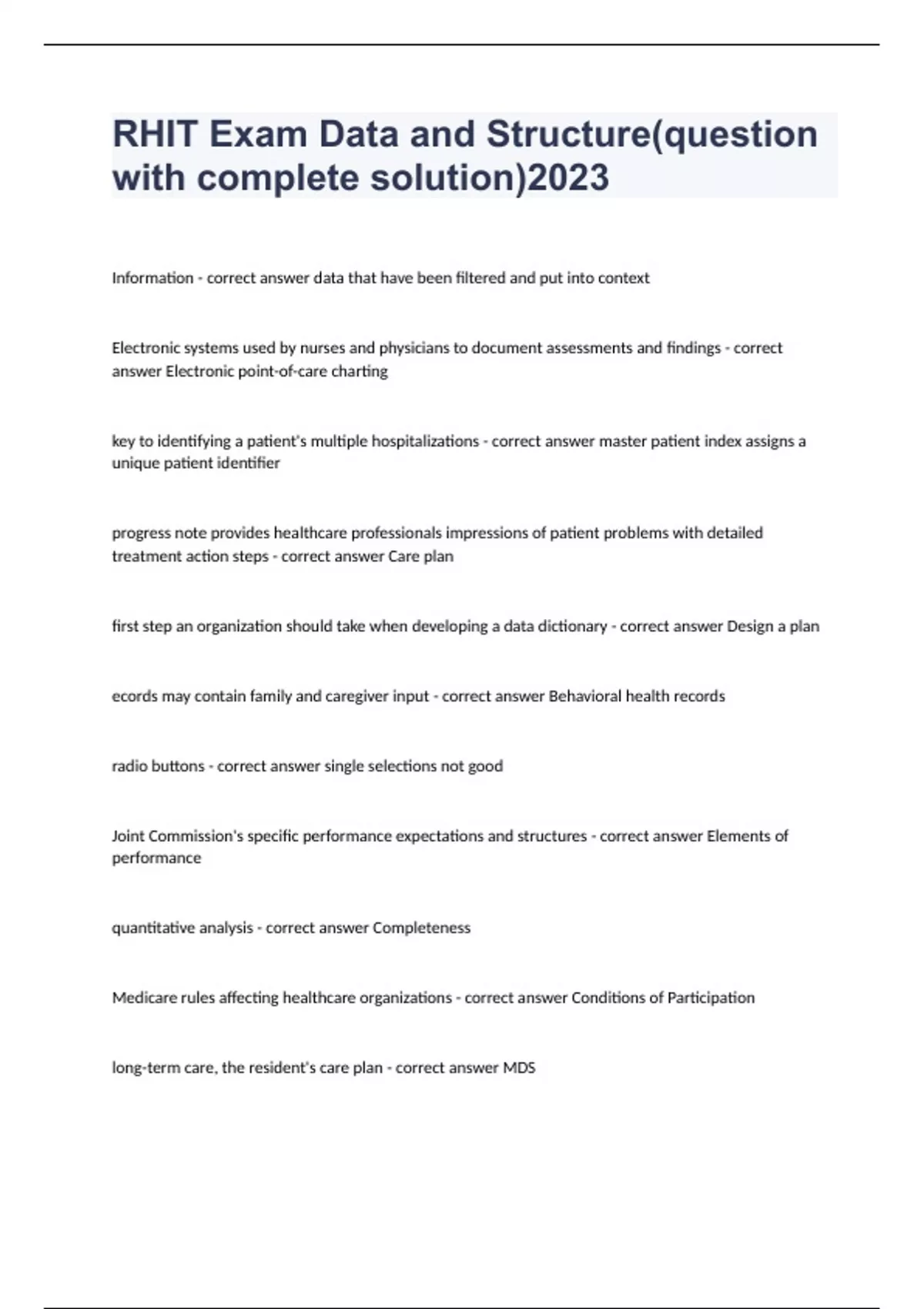 RHIT Exam Data and Structure(question with complete solution)2023 Information - correct answer data that have been filtered and put into context Electronic systems used by nurses and physicians to document assessments and findings - correct answer Electronic point-of-care charting key to identifying a patient's multiple hospitalizations - correct answer master patient index assigns a unique patient identifier progress note provides healthcare professionals impressions of patient problems with detailed treatment action steps - correct answer Care plan first step an organization should take when developing a data dictionary - correct answer Design a plan ecords may contain family and caregiver input - correct answer Behavioral health records radio buttons - correct answer single selections not good Joint Commission's specific performance expectations and structures - correct answer Elements of performance quantitative analysis - correct answer Completeness Medicare rules affecting healthcare organizations - correct answer Conditions of Participation long-term care, the resident's care plan - correct answer MDS receive room, board, and continuous nursing services in areas of the hospital where patients generally stay overnight; outpatients receive ambulatory diagnostic and therapeutic services`` - correct answer Inpatients help organizations measure and improve the quality, value, and outcomes of behavioral health and medical rehabilitation programs - correct answer Commission on Accreditation of Rehabilitation Facilities ontrolling information is - correct answer Information governance Discriminating attributes - correct answer used to disqualify two or more similar records the overarching authority that ensures the cohesive operation and integration of all EIM domains - correct answer Data governance a condition that determines what values an attribute or relationship can or must have which is one of the business rule categories - correct answer Constraint designing a data collection form to collect data on patients in an Acute-Care hospital - correct answer UHDDS a listing in diagnosis code number order for patients discharged from the facility during a particular time period. Each patient's diagnosis is converted from a verbal description to a numerical code, usually using the International Classification of Diseases - correct answer Disease index the number assigned to each case as it is entered into a cancer registry - correct answer accession number accession number - correct answer first digits of the year the patient was first seen at the facility, the remaining digits are assigned sequentially throughout the year data standardization - correct answer data dictionary
