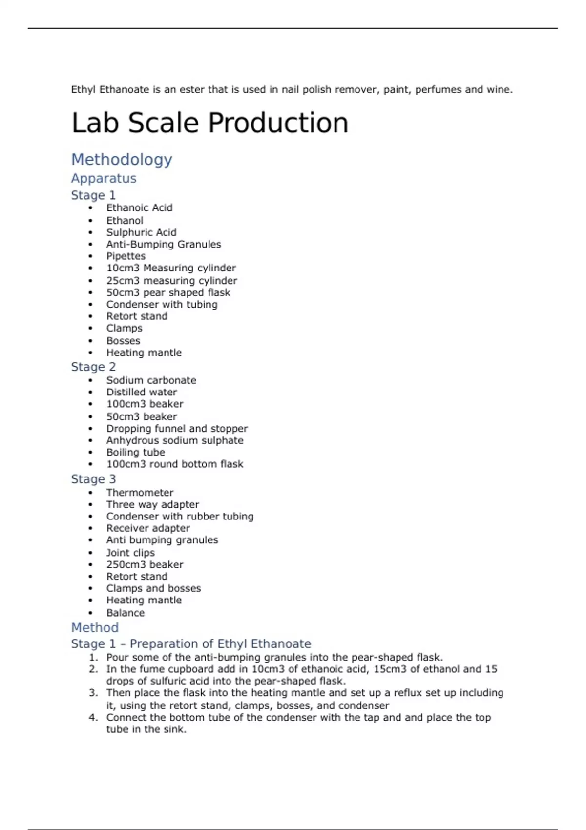 Stage 1 – Preparation of Ethyl Ethanoate