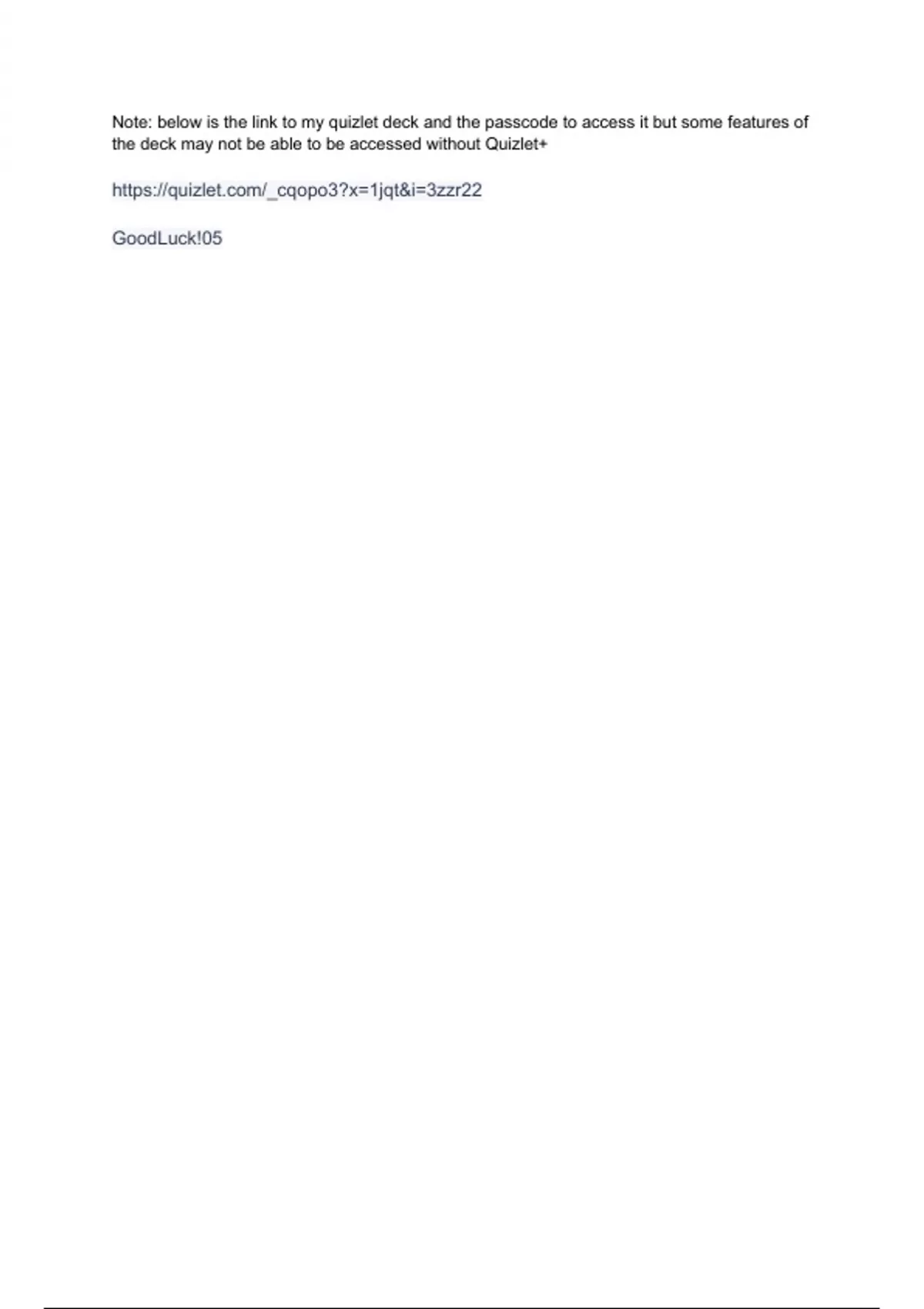 Note: below is the link to my quizlet deck and the passcode to access it but some features of