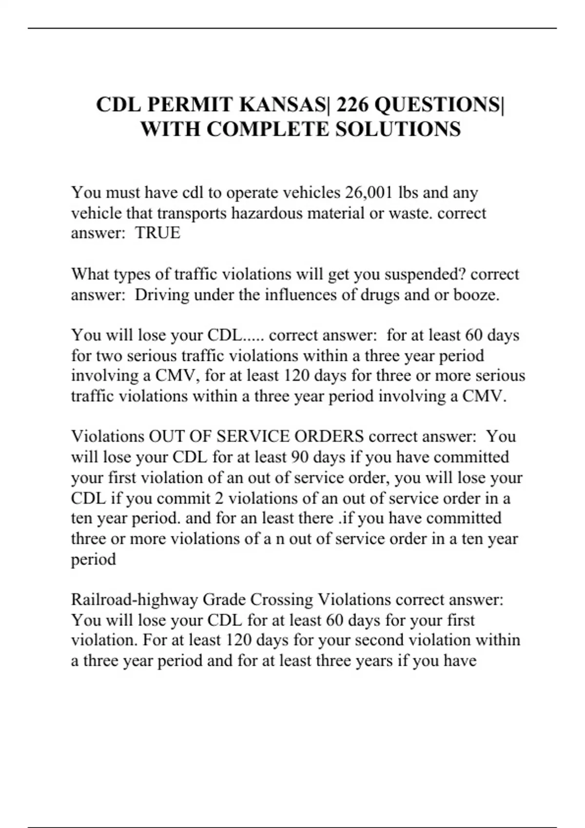 CDL PERMIT KANSAS| 226 QUESTIONS| WITH COMPLETE SOLUTIONS