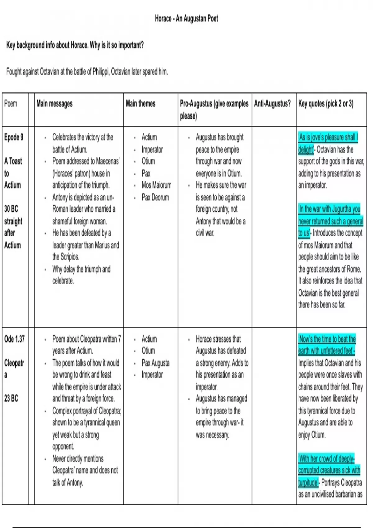 Poem Main messages Main themes Pro-Augustus (give examples Anti-Augustus? Key quotes (pick 2 or 3)