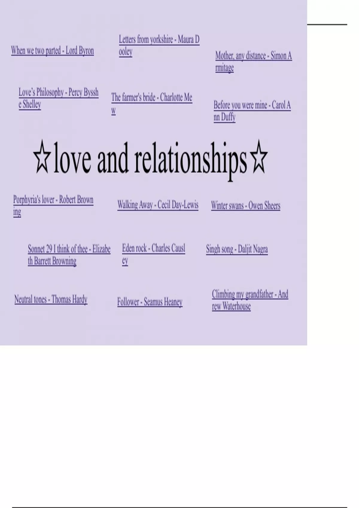 Porphyria's lover - Robert Brown Walking Away - Cecil Day-Lewis Winter swans - Owen Sheers