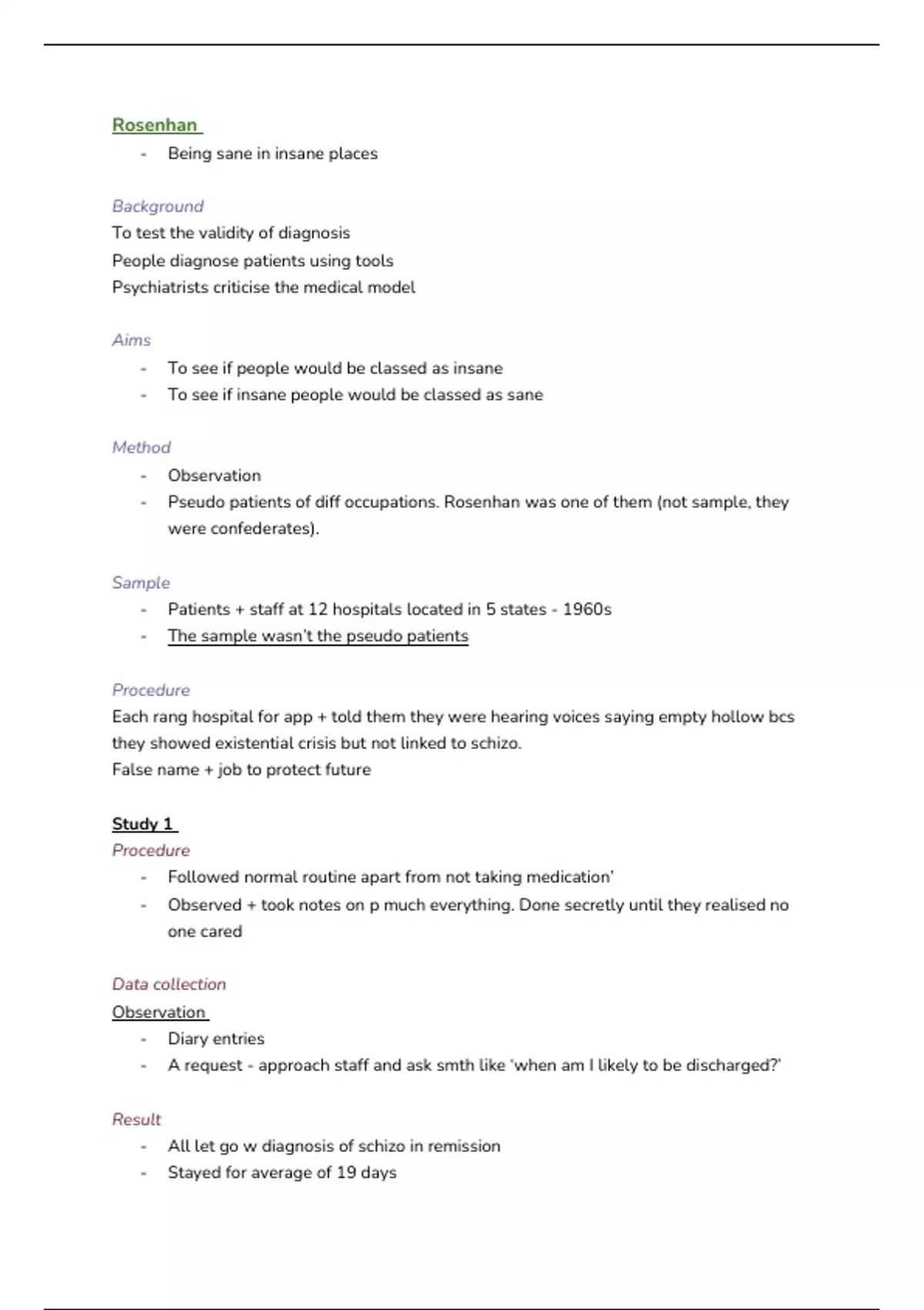 - Pseudo patients of diff occupations. Rosenhan was one of them (not sample, they
