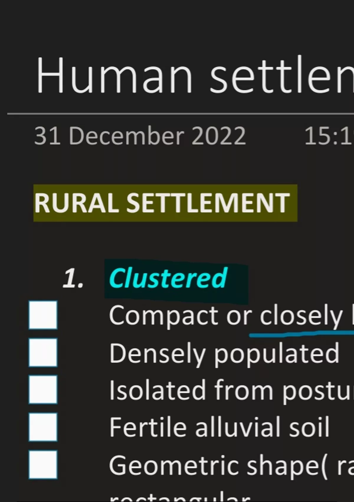 This document describes about human settlements. In this document each and every point of NCERT Book is included which will not only help in CUET but also for boards students. This notes is created keeping in mind about objective questions which will help in competitive exams.