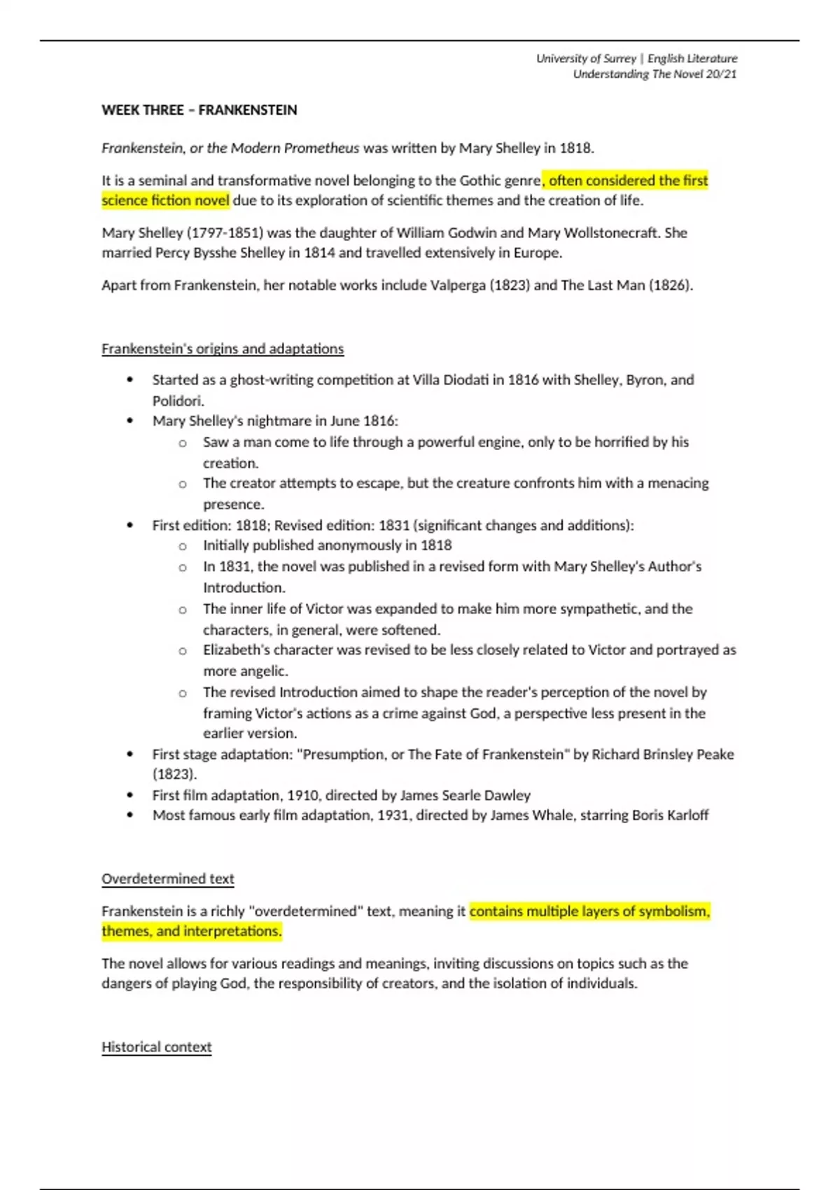 Understanding the Novel | Week 3 + 4 - Frankenstein