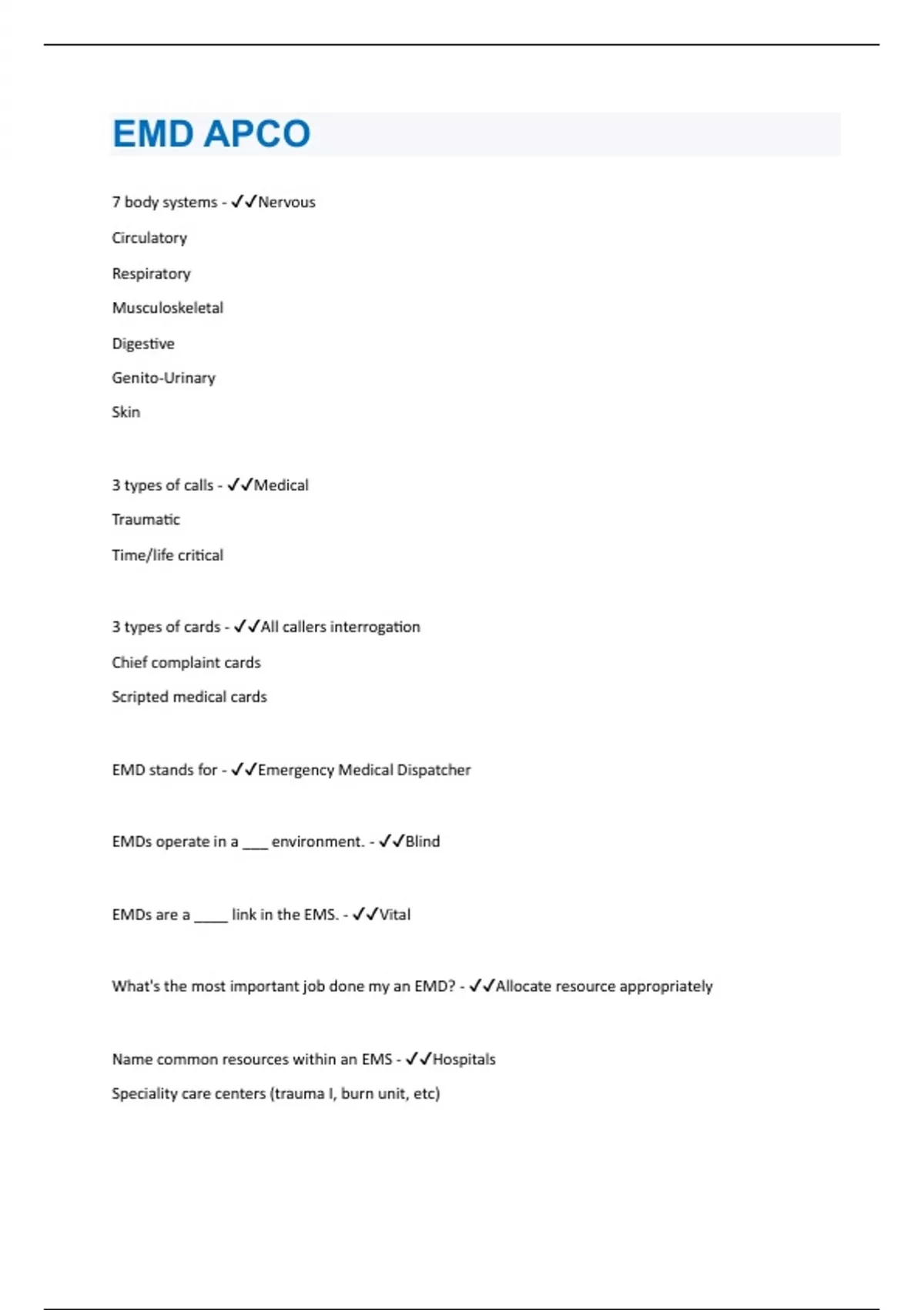 7 body systems - Nervous Circulatory Respiratory Musculoskeletal Digestive Genito-Urinary Skin 3 types of calls - Medical Traumatic Time/life critical 3 types of cards - All callers interrogation Chief complaint cards Scripted medical cards EMD stands for - Emergency Medical Dispatcher EMDs operate in a ___ environment. - Blind EMDs are a ____ link in the EMS. - Vital What's the most important job done my an EMD? - Allocate resource appropriately Name common resources within an EMS - Hospitals Speciality care centers (trauma I, burn unit, etc)