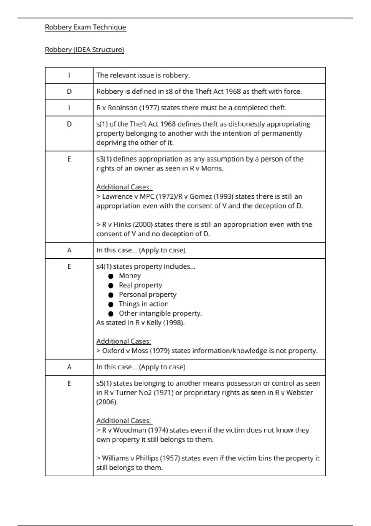 All of my law documents uploaded follow the AQA specification and are of A/A* quality. This document sets out the exam technique of how to write an answer for robbery in a scenario. The exam technique I follow is IDEA (Identify the relevant issue, Define the relevant issue, Explain the law pertaining to that relevant issue and then apply the law to the case).