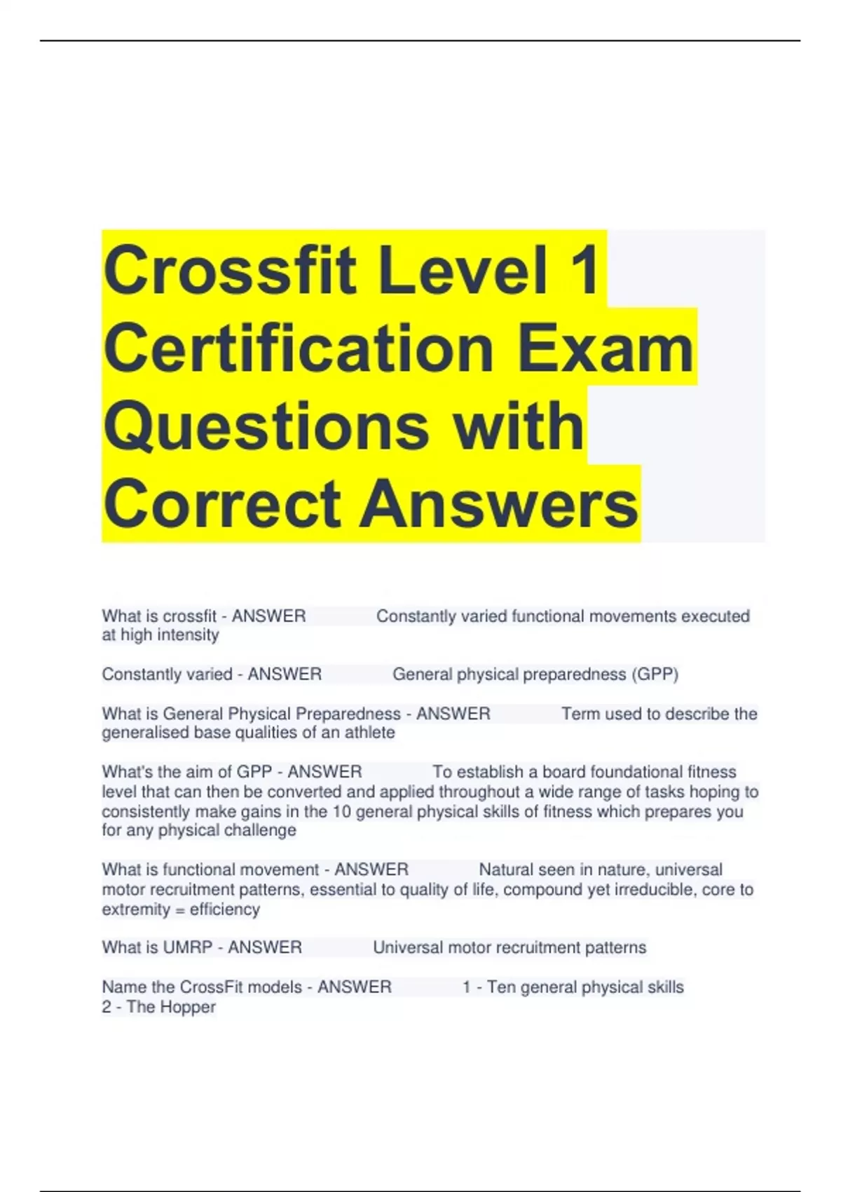 Crossfit Level 1 Certification Exam Questions with Correct Answers What is crossfit - ANSWER Constantly varied functional movements executed at high intensity Constantly varied - ANSWER General physical preparedness (GPP) What is General Physical Preparedness - ANSWER Term used to describe the generalised base qualities of an athlete What's the aim of GPP - ANSWER To establish a board foundational fitness level that can then be converted and applied throughout a wide range of tasks hoping to consistently make gains in the 10 general physical skills of fitness which prepares you for any physical challenge What is functional movement - ANSWER Natural seen in nature, universal motor recruitment patterns, essential to quality of life, compound yet irreducible, core to extremity = efficiency What is UMRP - ANSWER Universal motor recruitment patterns Name the CrossFit models - ANSWER 1 - Ten general physical skills 2 - The Hopper 3 - Three metabolic pathways 4 - Sickness Wellness Fitness Continuum What are the 10 general physical skills? - ANSWER 1 - cardio & respiratory endurance 2 - stamina 3 - strength 4 - flexibility 5 - power 6 - speed 7 - coordination 8 - agility 9 - balance 10 - accuracy Out of the 10 general physical skills which are organic and require training - ANSWER CVRE Stamina Strength Flexibility