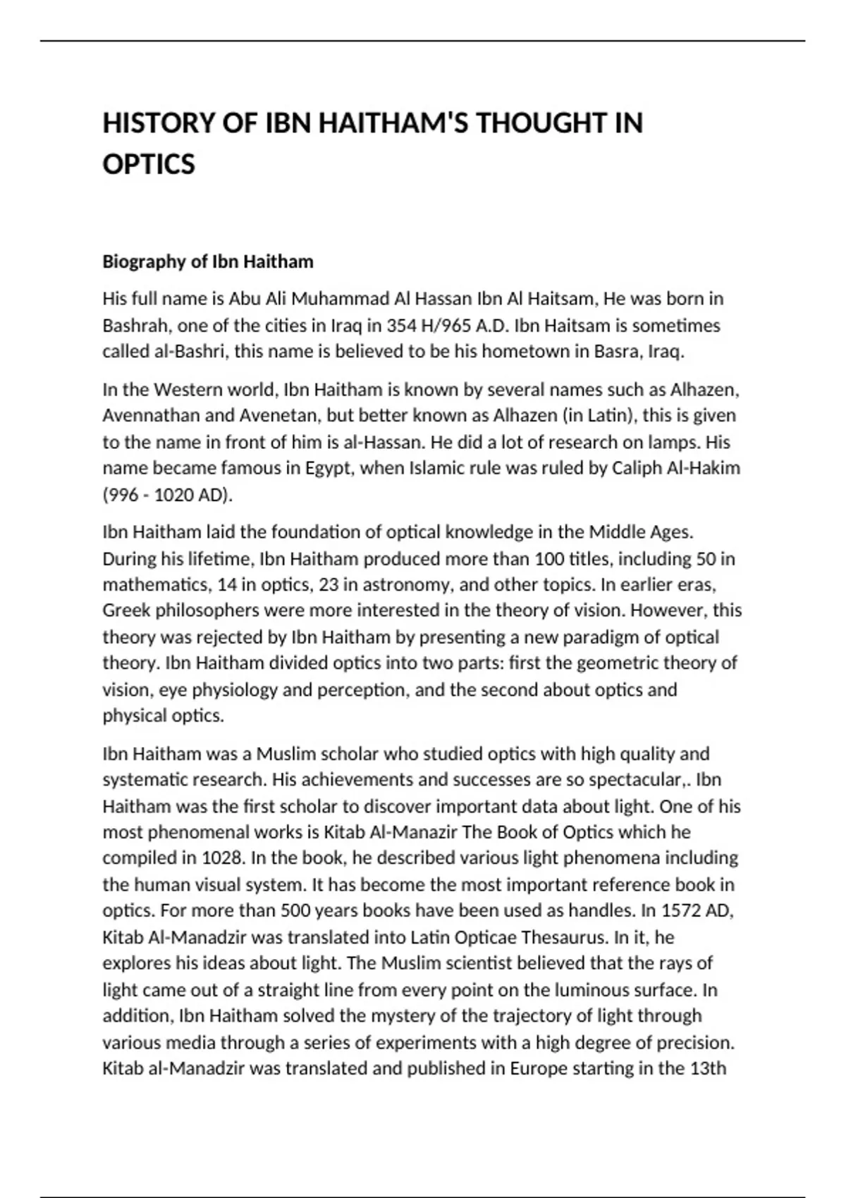 HISTORY OF IBN HAITHAM'S THOUGHT IN