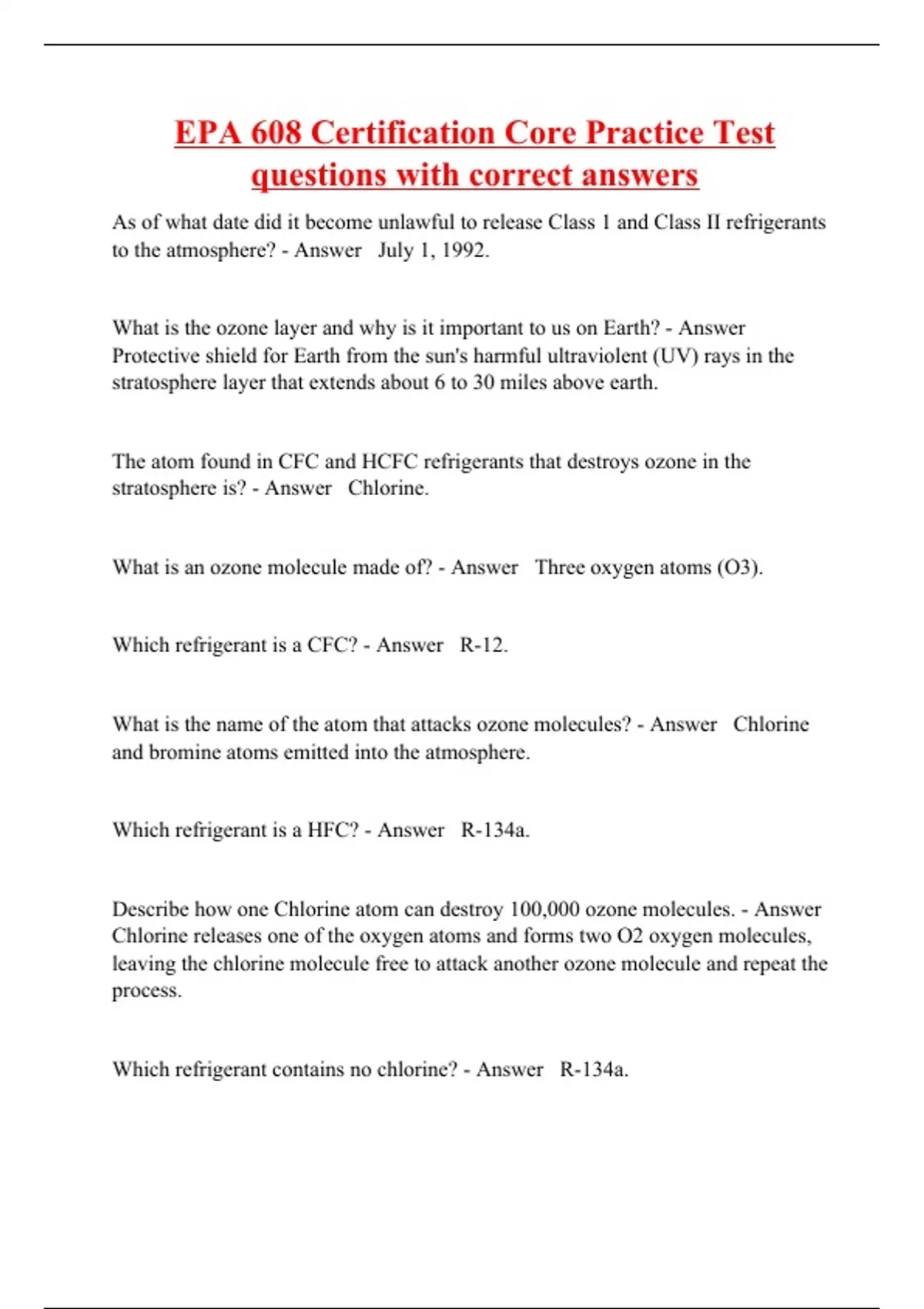 As of what date did it become unlawful to release Class 1 and Class II refrigerants to the atmosphere? - Answer July 1, 1992. What is the ozone layer and why is it important to us on Earth? - Answer Protective shield for Earth from the sun's harmful ultraviolent (UV) rays in the stratosphere layer that extends about 6 to 30 miles above earth. The atom found in CFC and HCFC refrigerants that destroys ozone in the stratosphere is? - Answer Chlorine. What is an ozone molecule made of? - Answer Three oxygen atoms (O3). Which refrigerant is a CFC? - Answer R-12. What is the name of the atom that attacks ozone molecules? - Answer Chlorine and bromine atoms emitted into the atmosphere.