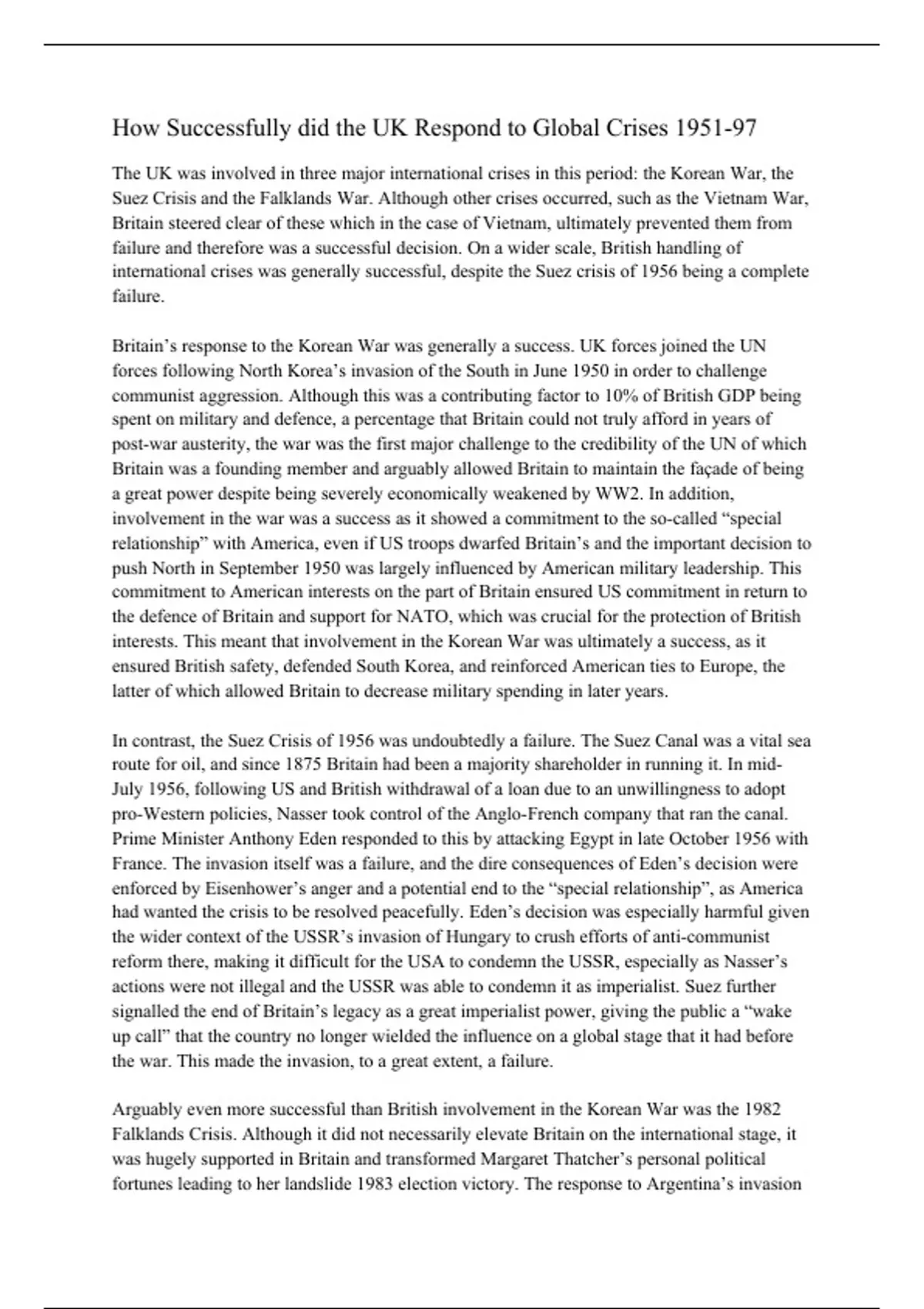 An essay on how successfully the UK responded to global crises from , discussing Korea, Suez and the Falklands. In-depth evaluation takes into account both public and international perception of British foreign policy in response to these crises, and how they changed how Britain saw itself on a global scale.
