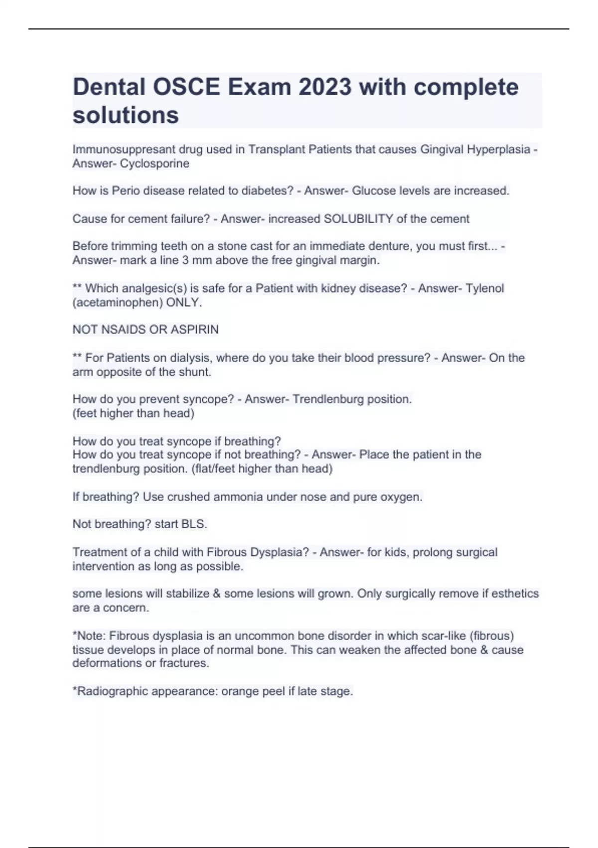 Immunosuppresant drug used in Transplant Patients that causes Gingival Hyperplasia - Answer- Cyclosporine How is Perio disease related to diabetes? - Answer- Glucose levels are increased. Cause for cement failure? - Answer- increased SOLUBILITY of the cement Before trimming teeth on a stone cast for an immediate denture, you must first... - Answer- mark a line 3 mm above the free gingival margin. ** Which analgesic(s) is safe for a Patient with kidney disease? - Answer- Tylenol (acetaminophen) ONLY. NOT NSAIDS OR ASPIRIN ** For Patients on dialysis, where do you take their blood pressure? - Answer- On the arm opposite of the shunt. How do you prevent syncope? - Answer- Trendlenburg position. (feet higher than head) How do you treat syncope if breathing? How do you treat syncope if not breathing? - Answer- Place the patient in the trendlenburg position. (flat/feet higher than head) If breathing? Use crushed ammonia under nose and pure oxygen. Not breathing? start BLS. Treatment of a child with Fibrous Dysplasia? - Answer- for kids, prolong surgical intervention as long as possible. some lesions will stabilize & some lesions will grown. Only surgically remove if esthetics are a concern. *Note: Fibrous dysplasia is an uncommon bone disorder in which scar-like (fibrous) tissue develops in place of normal bone. This can weaken the affected bone & cause deformations or fractures. *Radiographic appearance: orange peel if late stage. ** Treatment of barbiturate allergic reaction. - Answer- antihistamine (synergic reaction to barbituate) ** look at this. **Can you treat a patient who had Hepatitis A, one year ago? - Answer- yes. they can be treated "1 week after having jaundice" -- the exam referred to it as jaundice. At what intervals are intermediate dentures evaluated? - Answer- 24- hrs. 72- hrs. 1 week 1 month Every 3 months **How long to keep a dressing on after periodontal treatment? - Answer- Pack is kept in for 1 week after surgery. TX for Primary herpetic gingivostomatitis? - Answer- Palliative only - you only treat for fever and pain. Eagles Syndrome symptoms - Answer- Pain while swallowing, turning head, or mouth opening. may include dysphagia, dysphonia, otalgia, headaches, dizziness. * The elongation of styloid process// mineralization of the stylohyoid ligament. ** Epinepherine//vasoconstrictors are contraindicated in patients with ____________. They would exacerbate the symptoms. - Answer- hyperthyroid - My exam asked which anesthetic to use on someone with hyperthyroid patients. ** ** "Opalescent hue" - Answer- dentinogenesis imperfecta -- my exam showed a pic of eyes (blue sclera) and stated this patient had brittle bones. this exam intertwines osteogenesis imperfecta with DI, I think. OI was not an option. Radiographic findings of Dentinogenesis Imperfecta. - Answer- Bulbous crowns. Obliterated canals & Pulp chambers. Cervical Constrictions amelogenesis imperfecta heredity - Answer- dominant/recessive/x-linked. ** hypomaturation amelogenesis imperfecta manifests clinically as.... showed an image but it wasn't quite textbook - Answer- "Snowcapped" Pattern. Showed an image. this is due to the matrix not forming well. crystals are weird. hypoPLASTIC amelogenesis imperfecta manifests clinically as... - Answer- a generalized/localized pitted pattern on enamel typically. can be smooth/pitted/or rough. can be AD, AR, X-linked. Best TX for tetracycline stain - Answer- Veneers. ** Facial reduction for a PFM crown? - Answer- 1.5 mm. (( 1.0-1.5 mm)) * This is the same for lingual reduction* ** If a Traumatic ulcer is formed after extraction. What is the treatment? - Answer- Observe// Re-evaluate (2 weeks) ***Patient with tenderness anterior to ear lobe? - Answer- Inflammed Stenson's duct (Parotid duct). *** asked about this MANY TIMES ***After SRP, a patient notices more spaces between teeth. why? - Answer- decreased swelling of the gingiva. Radiograph with herringbone effect. Why? - Answer- film was placed backwards. "a reverse exposure of x-ray film" film that requires least amount of radiation? - Answer- e-speed. d-slowest-"dumb" e & f = fastest. How much epi can be given to a patient with BP of 160/110? - Answer- None. Don't treat this patient. Refer to physician. *** Patient with history of slow-growing mandible for 10 years, this is indicative of... - Answer- Hyper Pituitarism. ** Patient with history of weight gain, deepening voice, dry skin - Answer- hypothyroidism hashimoto's- autoimmunethyroiditis. exophthalmos is a sign of - Answer- Bulging eyes. Graves disease -- hypERthyroidism. Patient with diffuse pigmentation on the FOM & Ventral of tongue - Answer- addison's disease hypOadrenalism TX of Addison's (or of adrenal crisis)? - Answer- Corticosteroid replacement therapy. 3 uses of Corticosteroids? - Answer- 1. Anti-inflammatory: for allergic rxns like swelling, redness, arthritis, asthma, 2. Autoimmune 3. Adrenal crisis. also -- SLE or lichen plans. ** recurrent ulcers that heal with scarring** - Answer- major apthous ulcers -- if SCARRING is mentioned *** Treatment of major apthous ulcers - Answer- corticosteroids. *when in doubt always choose corticosteroids* Supernumerary teeth disease: if clavicles are present? if clavicles not present? - Answer- Gardners- with clavicles. Cleidocranial dysplasia - without clavicles. Best type of denture teeth to oppose natural dentition? - Answer- acrylic. 14 y.o. with inflamed gingiva - Answer- leukemia -- but will determine this from the CBC #'s they give. Ideal amount of undercut required for a circumferential clasp - Answer- 0.01 inch. Treatment of an extra-oral abscess which is non-odontogenic in origin? - Answer- hot compress ** showed an image and asked the tx of ranula? - Answer- surgical removal (excision) tx of mucocele - Answer- surgical removal Patients with no hair or teeth - Answer- ectodermal dysplasia ** (showed image) tx for geographic tongue - Answer- none. if pain exists - corticosteroids Be able to identify varicose in to