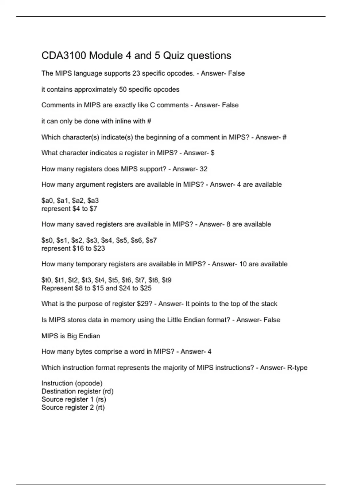 The MIPS language supports 23 specific opcodes. - Answer- False it contains approximately 50 specific opcodes Comments in MIPS are exactly like C comments - Answer- False it can only be done with inline with # Which character(s) indicate(s) the beginning of a comment in MIPS? - Answer- # What character indicates a register in MIPS? - Answer- $ How many registers does MIPS support? - Answer- 32 How many argument registers are available in MIPS? - Answer- 4 are available $a0, $a1, $a2, $a3 represent $4 to $7 How many saved registers are available in MIPS? - Answer- 8 are available $s0, $s1, $s2, $s3, $s4, $s5, $s6, $s7 represent $16 to $23 How many temporary registers are available in MIPS? - Answer- 10 are available $t0, $t1, $t2, $t3, $t4, $t5, $t6, $t7, $t8, $t9 Represent $8 to $15 and $24 to $25 What is the purpose of register $29? - Answer- It points to the top of the stack Is MIPS stores data in memory using the Little Endian format? - Answer- False MIPS is Big Endian How many bytes comprise a word in MIPS? - Answer- 4 Which instruction format represents the majority of MIPS instructions? - Answer- R-type Instruction (opcode) Destination register (rd) Source register 1 (rs) Source register 2 (rt)