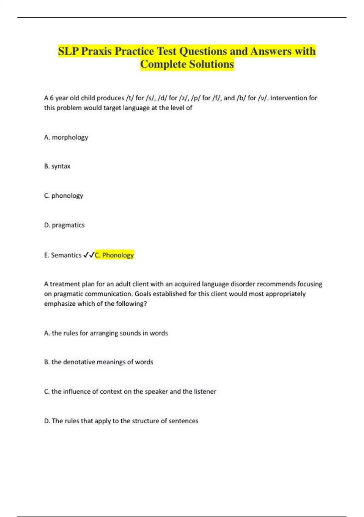 SLP Praxis Practice Test Questions and Answers with Complete Solutions A 6 year old child produces /t/ for /s/, /d/ for /z/, /p/ for /f/, and /b/ for /v/. Intervention for this problem would target language at the level of A. morphology B. syntax C. phonology D. pragmatics E. Semantics C. Phonology A treatment plan for an adult client with an acquired language disorder recommends focusing on pragmatic communication. Goals established for this client would most appropriately emphasize which of the following? A. the rules for arranging sounds in words B. the denotative meanings of words C. the influence of context on the speaker and the listener D. The rules that apply to the structure of sentences E. the perceptual properties of speech sounds C. The influence of context on the speaker and the listener Which of the following is the most important acoustic cue that distinguishes between an unreleased final /p/ and an unreleased final /b/, as in "cap" vs. "cab" A. Frequency of third formant B. locus frequency of burst C. Voice onset time D. Vocal fundamental frequency E. Duration of the preceding vowel E. Duration of the preceding vowel When using Roger Brown's system for computing mean length of utterance in a language sample, which of the following utterances would be scored as having two morphemes? A. Bought B. Doggie C. Walked D. Sticky E. Choo-choo C. Walked Anatomical studies of the human vocal folds and detailed observation of mucosal behavior during phonation has led to the current "cover-body" characterization of the vocal fold. Which of the following is included in the vocal fold cover A. the epithelium and superficial lamina propria B. The epithelium and deep lamina propria C. The intermediate and deep layers of the lamina propria D. The vocalis portion of the thyroarytenoid muscle E. The lamina of the thyroid cartilage A. The epithelium and superficial lamina propria Which of the following substitutions is most likely to occur in conjunction with hyponasality? A. /b/ for /m/ B. /n/ for /d/ C. /ng/ for /k/ D. glottal stop for /t/ E. /m/ for /p/ A. /b/ for /m/ Parents bring their daughter of 4 years and 3 months for a speech and language evaluation. The parents have expressed concern that their daughter does not pronounce the /r/ sound correctly and has exhibited periods of stuttering for the last 18 months. During the evaluation, the SLP observes that the child exhibits sound-syllable repetitions on 30 percent of her words. What is the best action for the SLP to take? A. Provide stuttering intervention, but no articulation intervention for /r/ at the present time B. Provide both articulation intervention for the /r/ and stuttering intervention C. Provide articulation intervention for the /r/ and ignore the stuttering D. Provide articulation intervention for the /r/ first and later provide stuttering intervention E. Provide no intervention at this time A. Provide stuttering intervention, but no articulation intervention for /r/ at the present time Voice therapy is least appropriate for clients with A. Ventricular phonation B. Acute laryngitis C. Vocal nodules D. Contact ulcers E. Unilateral Adductor Paralysis B. Acute Laryngitis An SLP is assessing the physiology of voice production in a client. If the client has a hyperfunctional voice disorder, then during phonation the client's average airflow rate is most likely to be A. almost absent B. lower or decreased C. higher or increased D. within normal limits E. erratic and inconsistent B. Lower or decreased