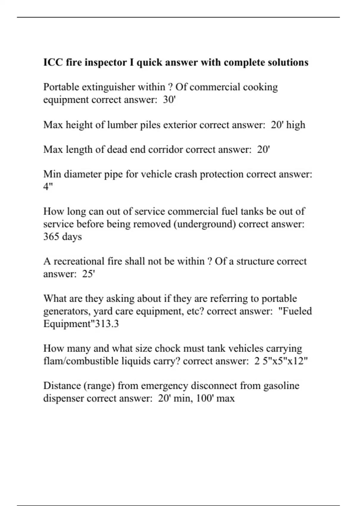 Portable extinguisher within ? Of commercial cooking equipment correct answer: 30' Max height of lumber piles exterior correct answer: 20' high Max length of dead end corridor correct answer: 20' Min diameter pipe for vehicle crash protection correct answer: 4" How long can out of service commercial fuel tanks be out of service before being removed (underground) correct answer: 365 days A recreational fire shall not be within ? Of a structure correct answer: 25' What are they asking about if they are referring to portable generators, yard care equipment, etc? correct answer: "Fueled Equipment"313.3 How many and what size chock must tank vehicles carrying flam/combustible liquids carry? correct answer: 2 5"x5"x12" Distance (range) from emergency disconnect from gasoline dispenser correct answer: 20' min, 100' max Class III standpipe shall be installed when lowest floor level is ? Or more above lowest FD access corr