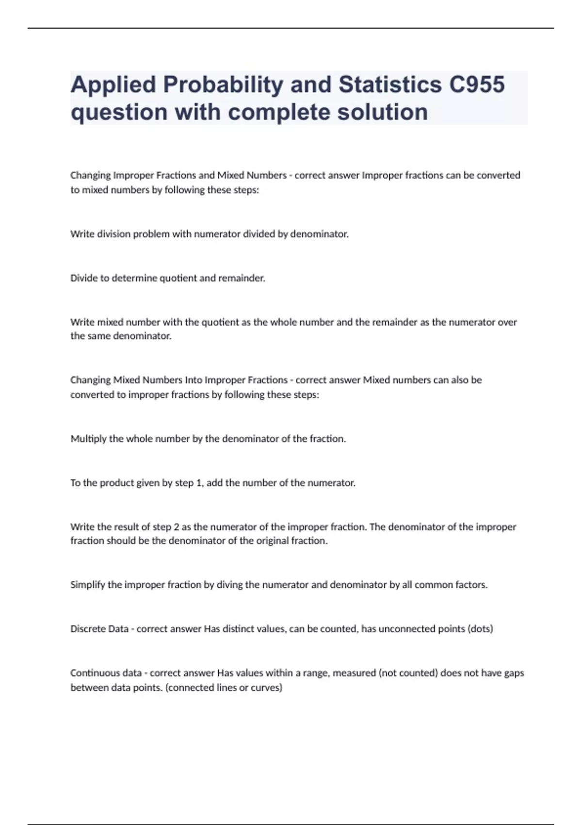 Applied Probability and Statistics C955 question with complete solution Changing Improper Fractions and Mixed Numbers - correct answer Improper fractions can be converted to mixed numbers by following these steps: Write division problem with numerator divided by denominator. Divide to determine quotient and remainder. Write mixed number with the quotient as the whole number and the remainder as the numerator over the same denominator. Changing Mixed Numbers Into Improper Fractions - correct answer Mixed numbers can also be converted to improper fractions by following these steps: Multiply the whole number by the denominator of the fraction. To the product given by step 1, add the number of the numerator. Write the result of step 2 as the numerator of the improper fraction. The denominator of the improper fraction should be the denominator of the original fraction. Simplify the improper fraction by diving the numerator and denominator by all common factors. Discrete Data - correct answer Has distinct values, can be counted, has unconnected points (dots) Continuous data - correct answer Has values within a range, measured (not counted) does not have gaps between data points. (connected lines or curves)