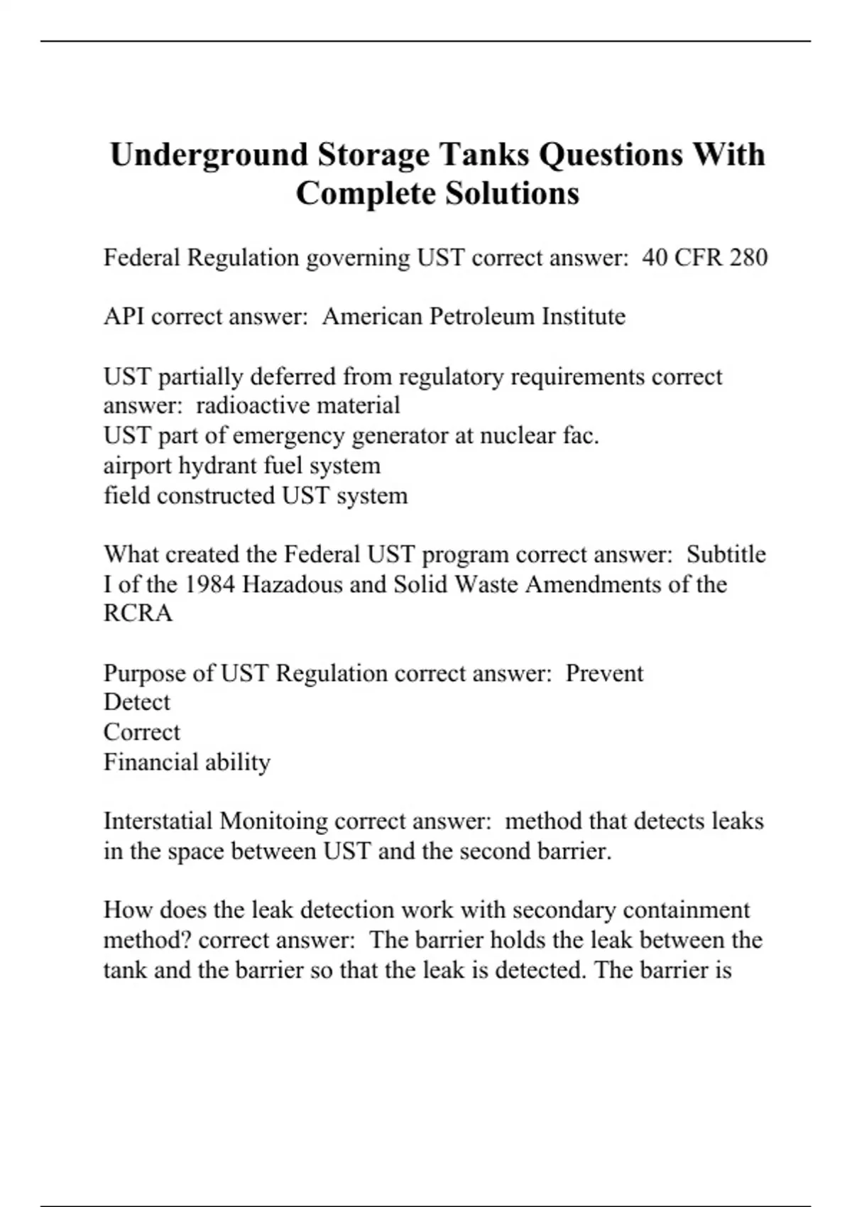 Federal Regulation governing UST correct answer: 40 CFR 280 API correct answer: American Petroleum Institute UST partially deferred from regulatory requirements correct answer: radioactive material UST part of emergency generator at nuclear fac. airport hydrant fuel system field constructed UST system What created the Federal UST program correct answer: Subtitle I of the 1984 Hazadous and Solid Waste Amendments of the RCRA Purpose of UST Regulation correct answer: Prevent Detect Correct Financial ability Interstatial Monitoing correct answer: method that detects leaks in the space between UST and the second barrier. How does the leak detection work with secondary containment method? correct answer: The barrier holds the leak between the tank and the barrier so that the leak is