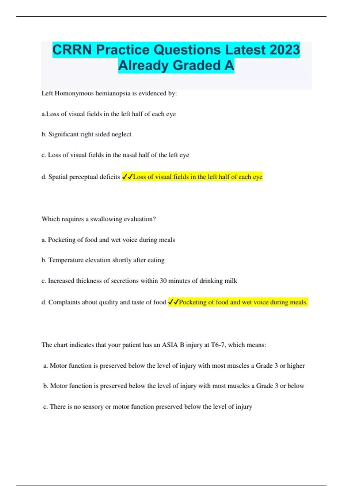 RRN Practice Questions Latest 2023 Already Graded A Left Homonymous hemianopsia is evidenced by: a.Loss of visual fields in the left half of each eye b. Significant right sided neglect c. Loss of visual fields in the nasal half of the left eye d. Spatial perceptual deficits Loss of visual fields in the left half of each eye Which requires a swallowing evaluation? a. Pocketing of food and wet voice during meals b. Temperature elevation shortly after eating c. Increased thickness of secretions within 30 minutes of drinking milk d. Complaints about quality and taste of food Pocketing of food and wet voice during meals. The chart indicates that your patient has an ASIA B injury at T6-7, which means: a. Motor function is preserved below the level of injury with most muscles a Grade 3 or higher b. Motor function is preserved below the level of injury with most muscles a Grade 3 or below c. There is no sensory or motor function preserved below the level of injury d. Sensory function is preserved below the level of injury and extends through S4-5 Sensory function is preserved below the level of injury and extends through S4-5 The occipital area of the brain is responsible for: a. Balance and co-ordination b. Perception of time passage c. Visual perception d. Writing, reading, and math skills Visual perception Which of the following patients is at higher risk for self-injury because of her diagnosis; a. Lacunar infarct b. Basilar artery infarct c. Left hemisphere stroke d. Right hemisphere stroke Right hemisphere stroke In your role as a change agent, you will assist your patient by: a. Establishing a change relationship b. Establishing barriers and assisting the patient in defining his challenges c. Assisting to maintain the status quo d. Functioning as a restrain force to control movement Establishing a change relationship Auditory association and the sense of time are associated with the: a. Frontal lobe b. Temporal lobe c. Parietal lobe d. Occipital lobe Temporal lobe Which bowel program is most appropriate for a patient who has had a spinal cord injury at C5-6: a. Enemas given daily in the morning to prevent incontinence during the day b. Consistent time of day associated with the gastrocolic reflex, triggering of reflex emptying with suppositories or digital stimulation c. Administration of laxatives and suppositories every evening timed within 6 hours of laxative administration d. Bulk fiber products used to form stool with toileting time at a consistent time of the day associated with the gastro-colic reflex Consistent time of day associated with the gastrocolic reflex, triggering of reflex emptying with suppositories or digital stimulation