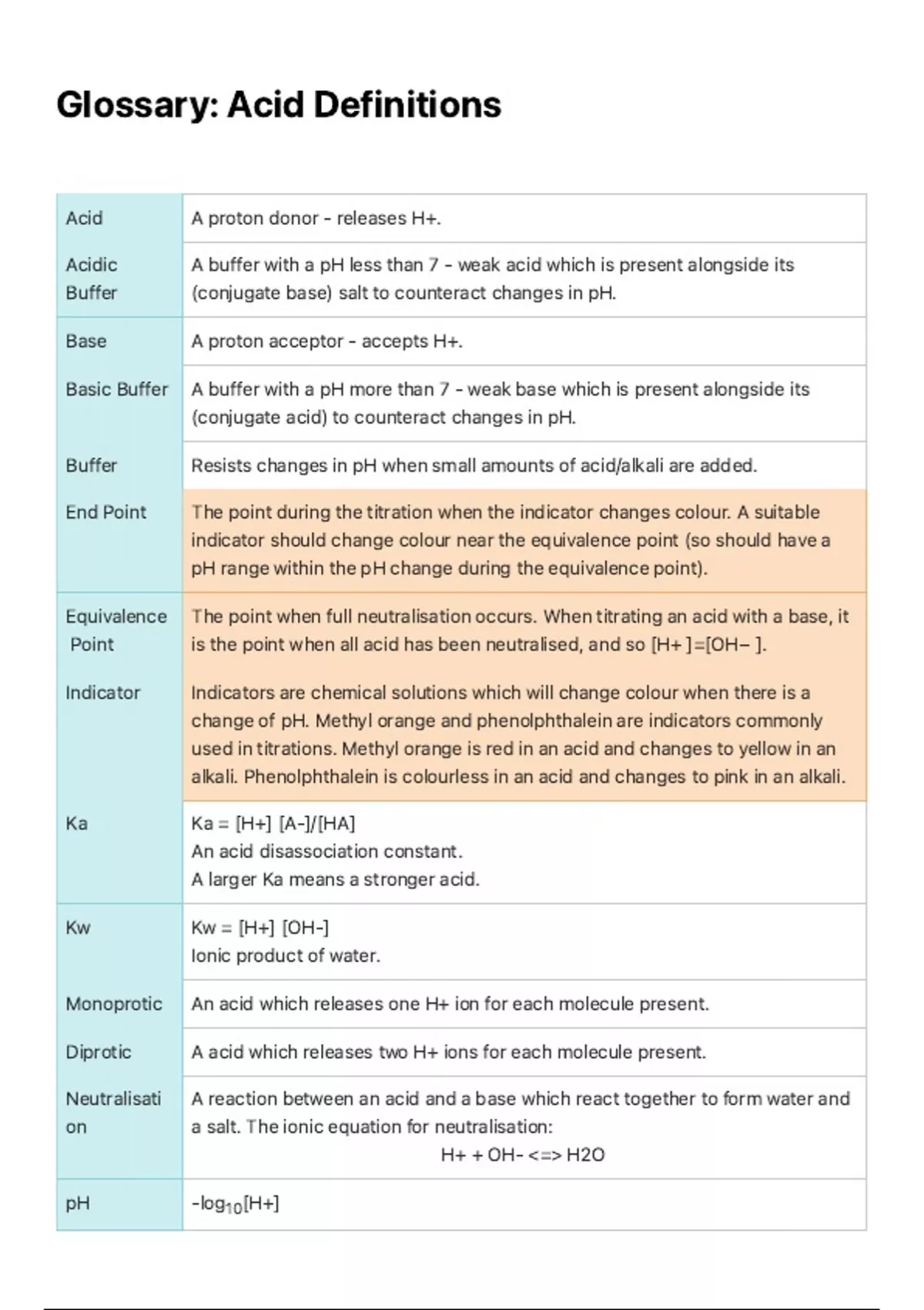 Equivalence The point when full neutralisation occurs. When titrating an acid with a base, it