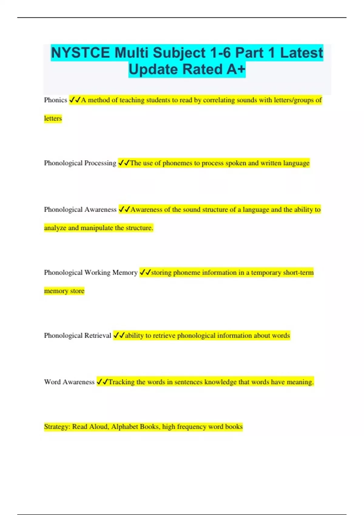 NYSTCE Multi Subject 1-6 Part 1 Latest Update Rated A+ Phonics A method of teaching students to read by correlating sounds with letters/groups of letters Phonological Processing The use of phonemes to process spoken and written language Phonological Awareness Awareness of the sound structure of a language and the ability to analyze and manipulate the structure. Phonological Working Memory storing phoneme information in a temporary short-term memory store Phonological Retrieval ability to retrieve phonological information about words Word Awareness Tracking the words in sentences knowledge that words have meaning. Strategy: Read Aloud, Alphabet Books, high frequency word books Responsiveness to Rhyme and alliteration during word play Enjoying and reciting learned Rhyming words or alliterative phrases in familiar storybooks/nursery rhymes. Syllable Awareness Counting, tapping, blending, or segmenting a word into syllables. Onset and Rime Manipulation Onset is the initial consonant in a one-syllable word. Rime includes the remaining sounds including the vowel and any sounds that follow. Phonemic Awareness Students awareness of the smallest unit of sounds in a word. Also refers to the ability to segment, blend, and manipulate these units. Phoneme Manipulation Tasks that tap into phonological processing, such as phoneme manipulation tasks (say "cat" without the Kuh) Orthographic Processing Defined as "the ability to form, store, and access orthographic representations." Orthography is the methodology of writing a language, which primarily consists of spelling, but includes, contractions, punctuation and capitalization.