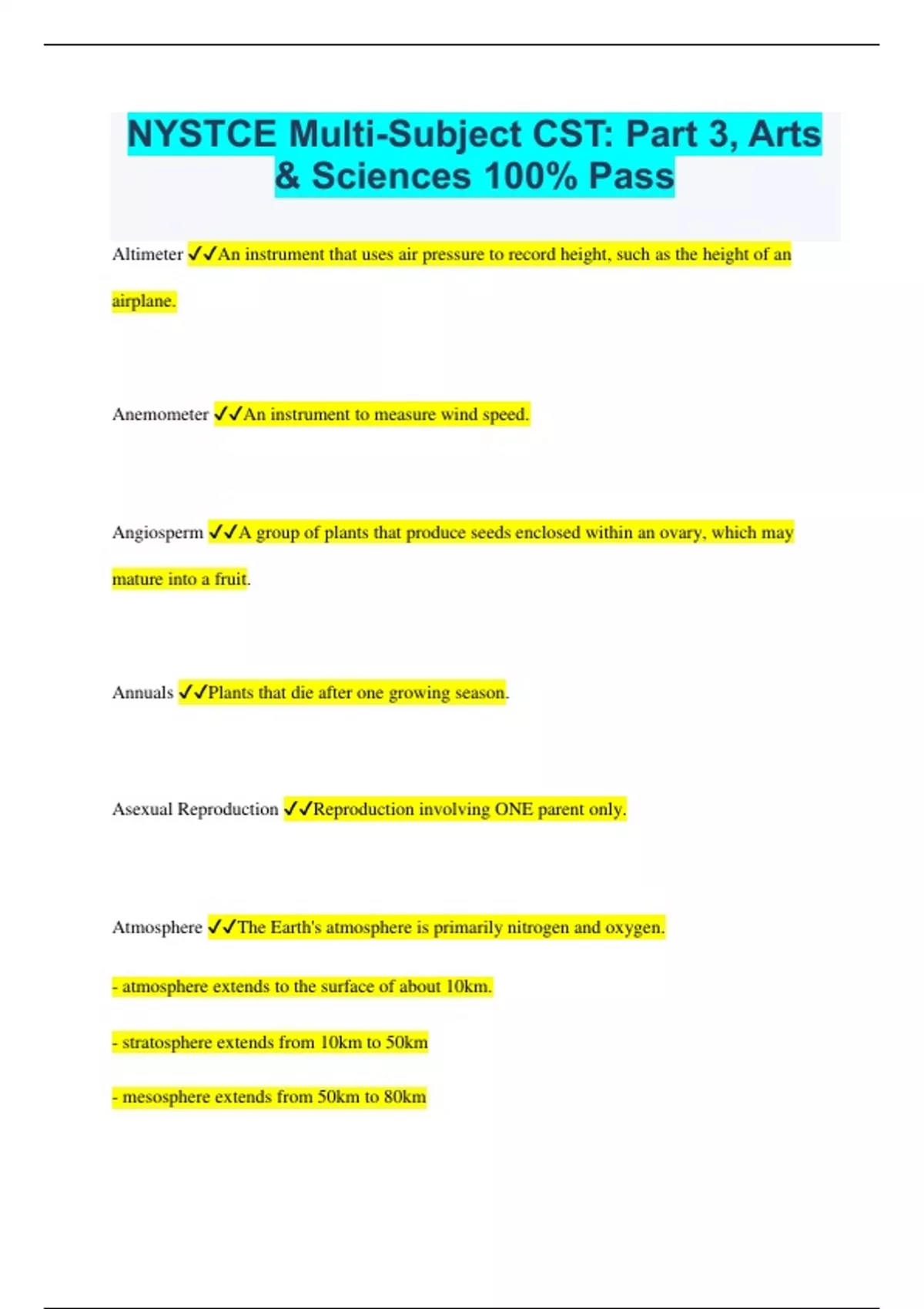 NYSTCE Multi-Subject CST: Part 3, Arts & Sciences 100% Pass Altimeter An instrument that uses air pressure to record height, such as the height of an airplane. Anemometer An instrument to measure wind speed. Angiosperm A group of plants that produce seeds enclosed within an ovary, which may mature into a fruit. Annuals Plants that die after one growing season. Asexual Reproduction Reproduction involving ONE parent only. Atmosphere The Earth's atmosphere is primarily nitrogen and oxygen. - atmosphere extends to the surface of about 10km. - stratosphere extends from 10km to 50km - mesosphere extends from 50km to 80km - thermosphere extends beyond 80km Aurora Borealis (Northern Lights) Light emission from the upper atmosphere that appear in many shapes and colors. Bacillus a rod-shaped bacteria. Blood Fluid that circulates throughout the body of an animal, distributing nutrients (usually oxygen). Canopy A layer of tree branches and other vegetation elevated above the ground. Carbon Dioxide (C02) A colorless, odorless gas that is important in the Earth's atmospheric greenhouse effect. Carcinogen A substance that can lead to cancer. Carcinoma A malignant (infectious) tumor, which forms in the skin and outside of internal organs. Carnivore An organism that eats meat, which includes animals, fungi, and plants. Ceilometer An instrument that measures cloud height. Cell A fundamental unit of all light. The cell consists of an outer plasma membrane, the cytoplasm, and genetic material (DNA). Celsius A temperature scale which freezes at 0 degrees and boils at 100 degrees. Chemical Properties Properties that do change the chemical nature of matter. - change results in an entirely different kind of matter. - burning, tarnishing, rusting, decomposing Chemotherapy A cancer treatment that includes chemicals toxic to malignant (infected)