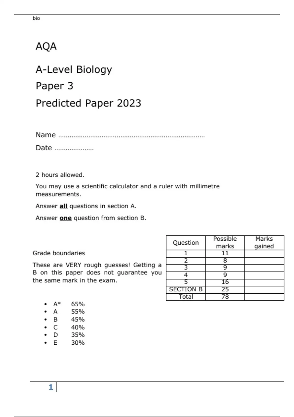 AQA A-Level Biology Paper 3 Predicted Paper 2023 attached with marking scheme
