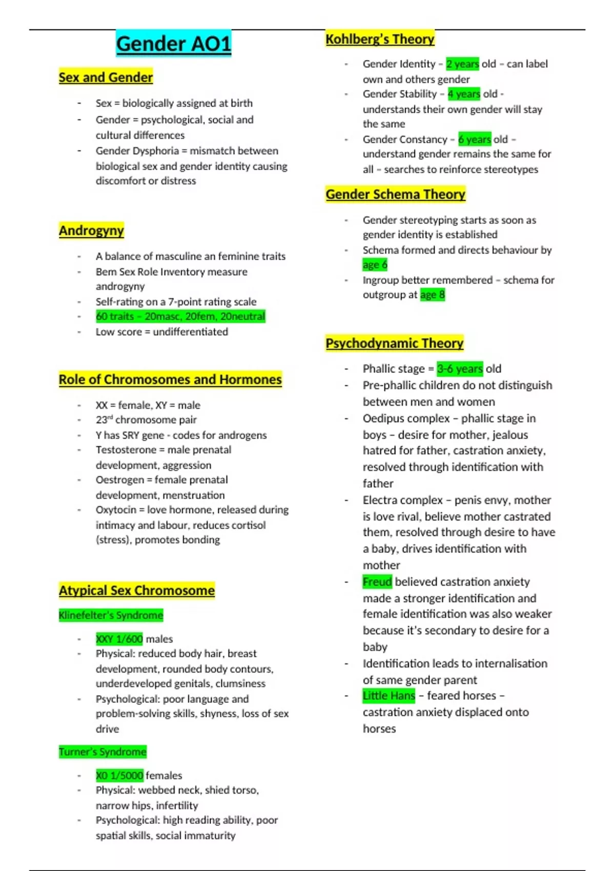 - Y has SRY gene - codes for androgens boys – desire for mother, jealous