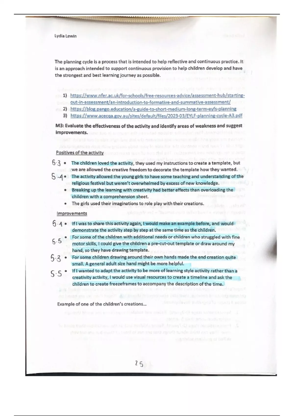 Assignments for Health and social care unit 8- creativity and activity in children and young people. Numbers and highlighted sections match the specification.