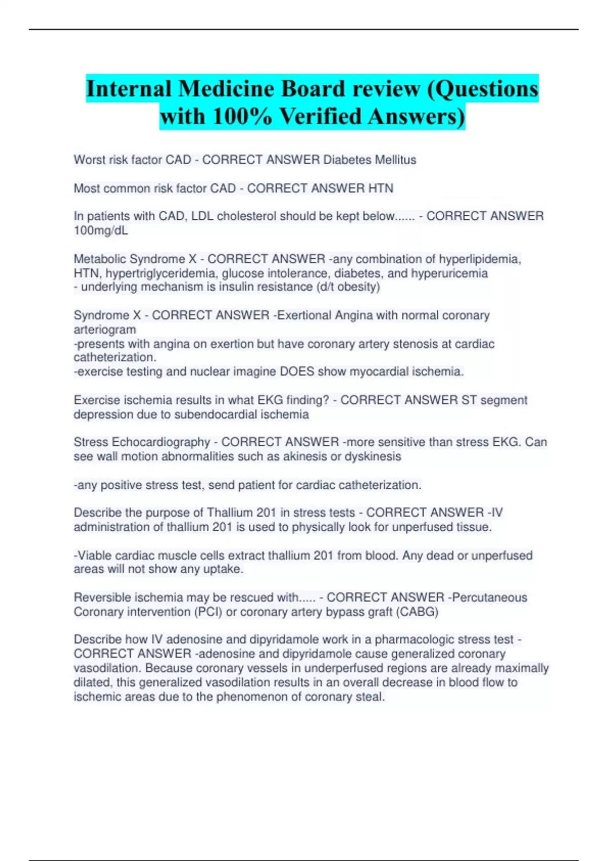 Internal Medicine Board review (Questions with 100% Verified Answers) Worst risk factor CAD - CORRECT ANSWER Diabetes Mellitus Most common risk factor CAD - CORRECT ANSWER HTN In patients with CAD, LDL cholesterol should be kept below...... - CORRECT ANSWER 100mg/dL Metabolic Syndrome X - CORRECT ANSWER -any combination of hyperlipidemia, HTN, hypertriglyceridemia, glucose intolerance, diabetes, and hyperuricemia - underlying mechanism is insulin resistance (d/t obesity) Syndrome X - CORRECT ANSWER -Exertional Angina with normal coronary arteriogram -presents with angina on exertion but have coronary artery stenosis at cardiac catheterization. -exercise testing and nuclear imagine DOES show myocardial ischemia. Exercise ischemia results in what EKG finding? - CORRECT ANSWER ST segment depression due to subendocardial ischemia Stress Echocardiography - CORRECT ANSWER -more sensitive than stress EKG. Can see wall motion abnormalities such as akinesis or dyskinesis -any positive stress test, send patient for cardiac catheterization. Describe the purpose of Thallium 201 in stress tests - CORRECT ANSWER -IV administration of thallium 201 is used to physically look for unperfused tissue. -Viable cardiac muscle cells extract thallium 201 from blood. Any dead or unperfused areas will not show any uptake. Reversible ischemia may be rescued with..... - CORRECT ANSWER -Percutaneous Coronary intervention (PCI) or coronary artery bypass graft (CABG) Describe how IV adenosine and dipyridamole work in a pharmacologic stress test - CORRECT ANSWER -adenosine and dipyridamole cause generalized coronary vasodilation. Because coronary vessels in underperfused regions are already maximally dilated, this generalized vasodilation results in an overall decrease in blood flow to ischemic areas due to the phenomenon of coronary steal