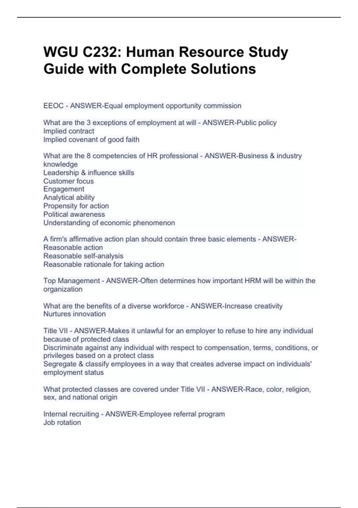 WGU C232: Human Resource Study Guide with Complete SolutionsWGU C232: Human Resource Study Guide with Complete SolutionsWGU C232: Human Resource Study Guide with Complete SolutionsWGU C232: Human Resource Study Guide with Complete SolutionsWGU C232: Human Resource Study Guide with Complete SolutionsWGU C232: Human Resource Study Guide with Complete Solutions EEOC - ANSWER-Equal employment opportunity commission What are the 3 exceptions of employment at will - ANSWER-Public policy Implied contract Implied covenant of good faith What are the 8 competencies of HR professional - ANSWER-Business & industry knowledge Leadership & influence skills Customer focus Engagement Analytical ability Propensity for action Political awareness Understanding of economic phenomenon A firm's affirmative action plan should contain three basic elements - ANSWER-Reasonable action Reasonable self-analysis Reasonable rationale for taking action Top Management - ANSWER-Often determines how important HRM will be within the organization