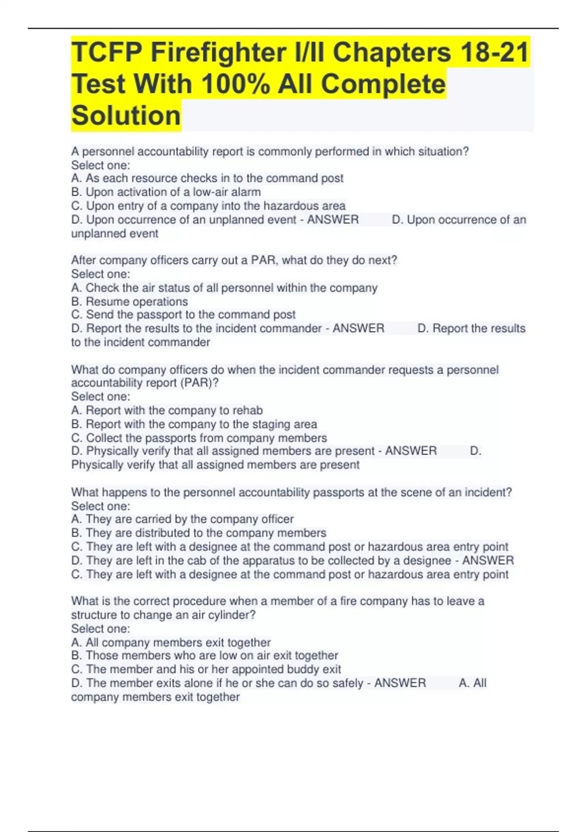 TCFP Firefighter I/II Chapters 18-21 Test With 100% All Complete Solution A personnel accountability report is commonly performed in which situation? Select one: A. As each resource checks in to the command post B. Upon activation of a low-air alarm C. Upon entry of a company into the hazardous area D. Upon occurrence of an unplanned event - ANSWER D. Upon occurrence of an unplanned event After company officers carry out a PAR, what do they do next? Select one: A. Check the air status of all personnel within the company B. Resume operations C. Send the passport to the command post D. Report the results to the incident commander - ANSWER D. Report the results to the incident commander What do company officers do when the incident commander requests a personnel accountability report (PAR)? Select one: A. Report with the company to rehab B. Report with the company to the staging area C. Collect the passports from company members D. Physically verify that all assigned members are present - ANSWER D. Physically verify that all assigned members are present What happens to the personnel accountability passports at the scene of an incident? Select one: A. They are carried by the company officer B. They are distributed to the company members C. They are left with a designee at the command post or hazardous area entry point D. They are left in the cab of the apparatus to be collected by a designee - ANSWER C. They are left with a designee at the command post or hazardous area entry point What is the correct procedure when a member of a fire company has to leave a structure to change an air cylinder? Select one: A. All company members exit together B. Those members who are low on air exit together C. The member and his or her appointed buddy exit D. The member exits alone if he or she can do so safely - ANSWER A. All company members exit together What is the function of a personnel accountability system? Select one: A. Prevent freelancing and deviation from SOPs B. Establish and maintain team integrity C. Organize resources into divisions, groups, and crews D. Track the location and assignments of all personnel at the incident - ANSWER D. Track the location and assignments of all personnel at the incident What is the most basic method for staying oriented inside a low-visibility environment? Select one: A. Use of a guide rope B. Staying in contact with a wall C. Staying in contact with a partner D. Staying in contact with the hose line - ANSWER D. Staying in contact with the hose line What is the term for a roll call taken by a supervisor at an emergency incident? Select one: A. Status and location check B. Resource status report C. Personnel safety check D. Personnel accountability report - ANSWER D. Personnel accountability report When should you declare a mayday? Select one: A. When you find a victim and need assistance with the rescue B. When you find yourself in an IDLH atmosphere C. When you have been unable to self-rescue D. As soon as you think you might be in trouble - ANSWER D. As soon as you think you might be in trouble Which term means that a fire company arrives together, works together, and leaves together? Select one: A. Team integrity B. Personnel accountability C. Span of control D. Unity of command - ANSWER A. Team integrity A standard approach to risk-benefit analysis should be incorporated into an agency's