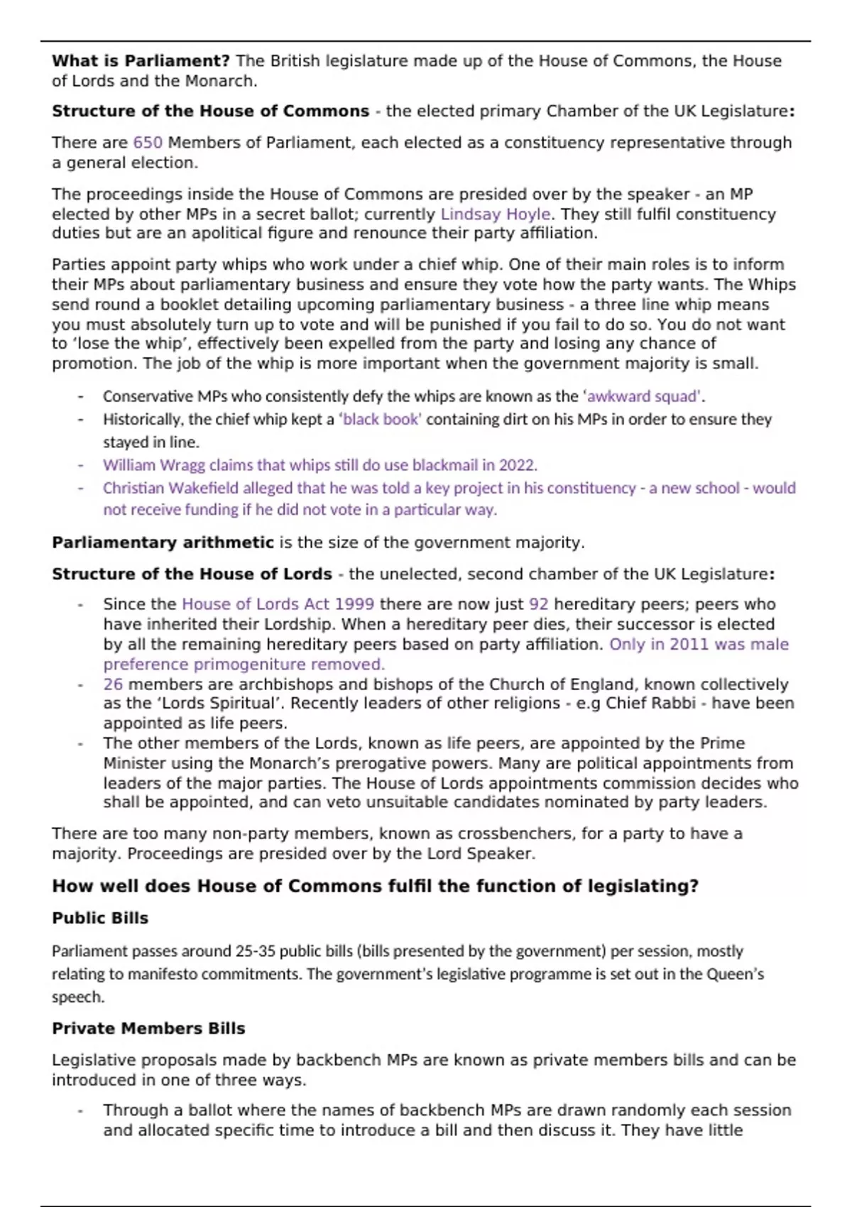 Comprehensive A* politics notes for the UK Parliament. Includes in depth analysis, essay points, and up to date examples for all the areas of this topic: the House of Commons, the House of Lords, scrutiny, representation, legislation and legitimisation. Everything you would need for an A*.