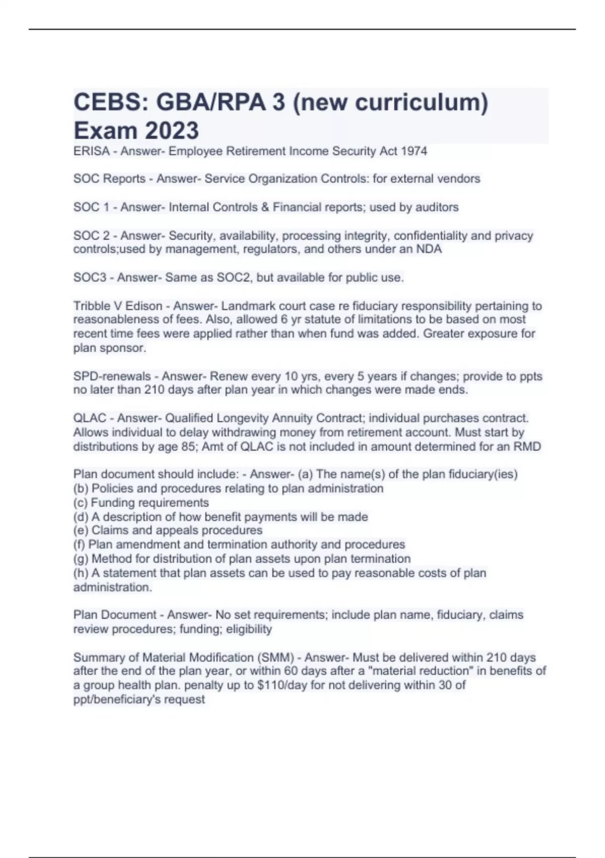 ERISA - Answer- Employee Retirement Income Security Act 1974 SOC Reports - Answer- Service Organization Controls: for external vendors SOC 1 - Answer- Internal Controls & Financial reports; used by auditors SOC 2 - Answer- Security, availability, processing integrity, confidentiality and privacy controls;used by management, regulators, and others under an NDA SOC3 - Answer- Same as SOC2, but available for public use. Tribble V Edison - Answer- Landmark court case re fiduciary responsibility pertaining to reasonableness of fees. Also, allowed 6 yr statute of limitations to be based on most recent time fees were applied rather than when fund was added. Greater exposure for plan sponsor. SPD-renewals - Answer- Renew every 10 yrs, every 5 years if changes; provide to ppts no later than 210 days after plan year in which changes were made ends. QLAC - Answer- Qualified Longevity Annuity Contract; individual purchases contract. Allows individual to delay withdrawing money from retirement account. Must start by distributions by age 85; Amt of QLAC is not included in amount determined for an RMD Plan document should include: - Answer- (a) The name(s) of the plan fiduciary(ies) (b) Policies and procedures relating to plan administration (c) Funding requirements (d) A description of how benefit payments will be made (e) Claims and appeals procedures (f) Plan amendment and termination authority and procedures (g) Method for distribution of plan assets upon plan termination (h) A statement that plan assets can be used to pay reasonable costs of plan administration. Plan Document - Answer- No set requirements; include plan name, fiduciary, claims review procedures; funding; eligibility Summary of Material Modification (SMM) - Answer- Must be delivered within 210 days after the end of the plan year, or within 60 days after a "material reduction" in benefits of a group health plan. penalty up to $110/day for not delivering within 30 of ppt/beneficiary's request Social Insurance-Fully Insured - Answer- 40 credits/quarters of coverage 1 credit for each $x earned (2017-$1300) Adjusted for inflation Must be fully insured to be eligible for retirement benefits Currently Insured - Answer- At least 6 credits in last 13 calendar quarters ending with quarter of death, disability, or entitlement to retirement benefits. Disability Insured - Answer- Two work tests: 1) recent work test; depends on age at disability. and 2)duration of work test (doesn't require work within a certain period of time) FASB ASC 960 - Answer- Defined Benefit Plans; establishes the accounting and financial reporting standards. Under DOL ERs can file one set FASB ASC 960-which plans - Answer- All ongoing plans-Funded and Unfunded that provide pension benefits a) plans subject to ERISA b) plans not subject to ERISA c) plans without intermediary funding agencies or plans financed through trusts, contracts of insurance or a combination thereof DOES NOT APPLY to gov sponsored SS plans FASB ASC 960-Acctg and Reporting - Answer- a) accrual basis, include statement of net assets available at the end of the year and a statement of a change in assets b) plan investments- FAIR value except for insur contracts c) info on actuarial PV and sig changes d) accumulated plan benefits one of three options: -face of statement -net assets available for benefits -separate statements or in notes of fin statements e) actuarial PV of accumulated plan benefits baed on EE earnings 2014 DOL Audit quality study - Answer- Almost 40% of benefit plan audits had unacceptable major deficiencies 3 types of deficiencies/weaknesses - Answer- 1)Internal Plan Processes 2)Regulatory requirements 3) Outside Service Providers Deficiency-408(b)(2) - Answer- Lack of proper monitoring of service provider fees and disclosures. Impt b/c a service provider is a party in interest. If not written down, they are considered unreasonable Two types of fraud - Answer- 1)Mi