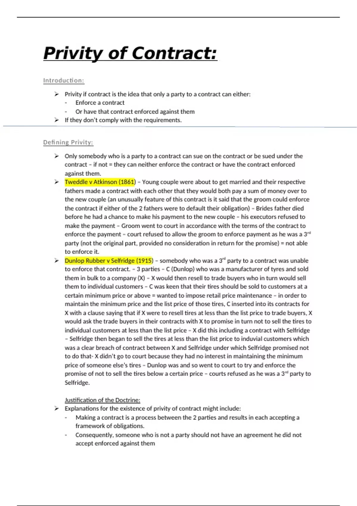 A very in depth explanation and analysis of privity of contract law covering the definition, exceptions and Rights of Third parties Act. To better your understanding I have explained the cases referenced in the notes.