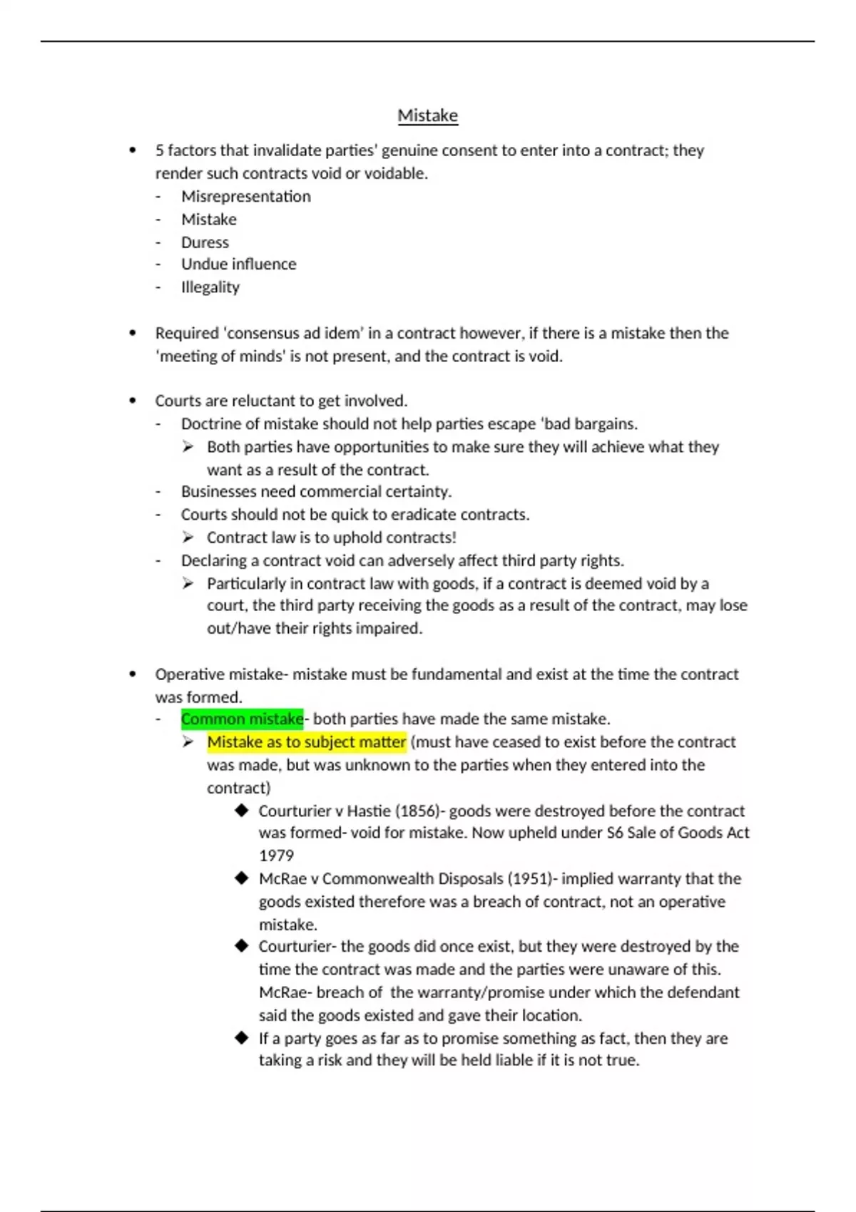 A detailed breakdown of mistake in regards to contract law including the cases and a brief explanation of them to maximize understanding. Covers: misrepresentation, mistake, duress, undue influence and illegality.