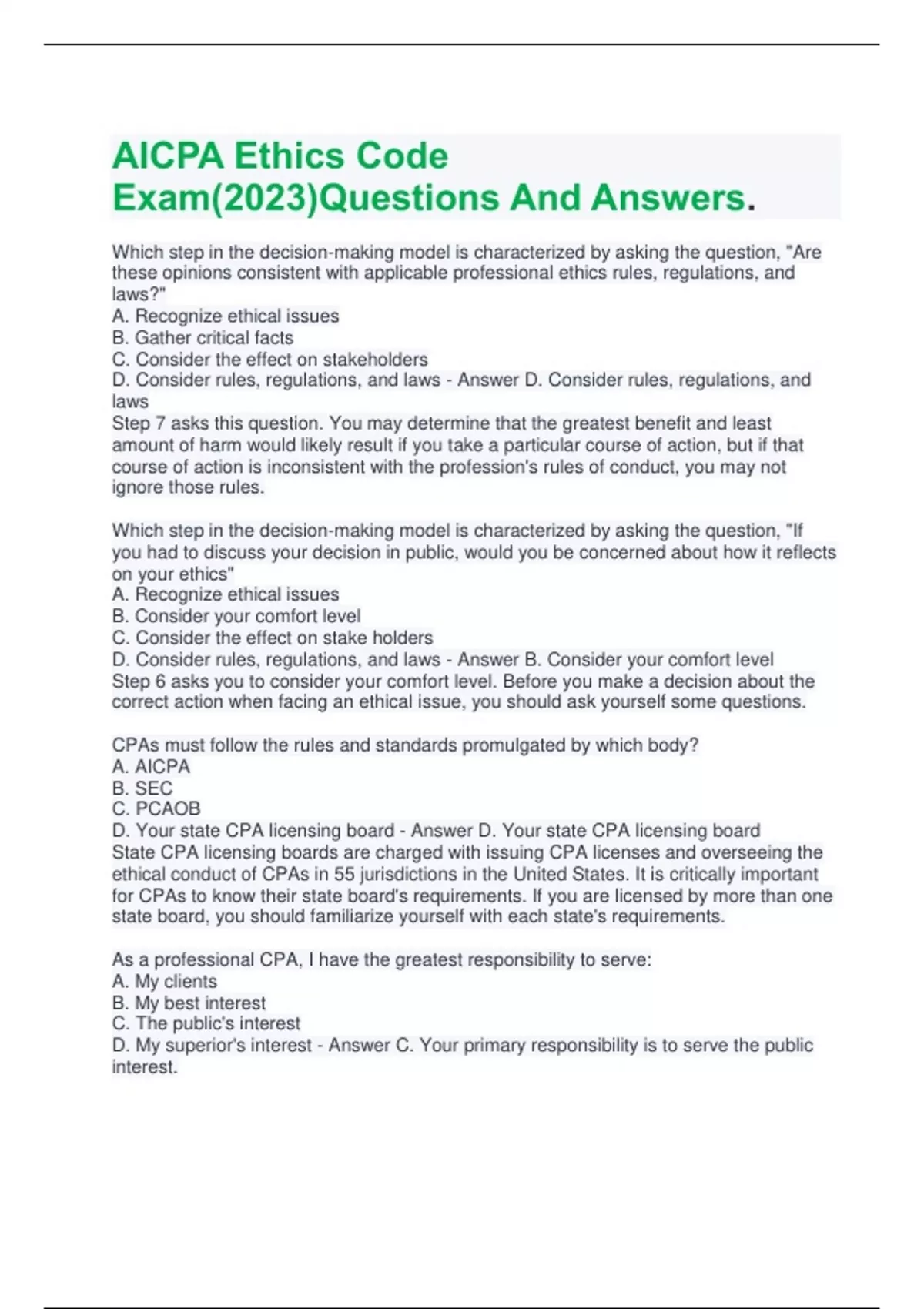 Which step in the decision-making model is characterized by asking the question, "Are these opinions consistent with applicable professional ethics rules, regulations, and laws?" A. Recognize ethical issues B. Gather critical facts C. Consider the effect on stakeholders D. Consider rules, regulations, and laws - Answer D. Consider rules, regulations, and laws Step 7 asks this question. You may determine that the greatest benefit and least amount of harm would likely result if you take a particular course of action, but if that course of action is inconsistent with the profession's rules of conduct, you may not ignore those rules. Which step in the decision-making model is characterized by asking the question, "If you had to discuss your decision in public, would you be concerned about how it reflects on your ethics" A. Recognize ethical issues B. Consider your comfort level C. Consider the effect on stake holders D. Consider rules, regulations, and laws - Answer B. Consider your comfort level Step 6 asks you to consider your comfort level. Before you make a decision about the correct action when facing an ethical issue, you should ask yourself some questions. CPAs must follow the rules and standards promulgated by which body? A. AICPA B. SEC C. PCAOB D. Your state CPA licensing board - Answer D. Your state CPA licensing board State CPA licensing boards are charged with issuing CPA licenses and overseeing the ethical conduct of CPAs in 55 jurisdictions in the United States. It is critically important for CPAs to know their state board's requirements. If you are licensed by more than one state board, you should familiarize yourself with each state's requirements. As a professional CPA, I have the greatest responsibility to serve: A. My clients B. My best interest C. The public's interest D. My superior's interest - Answer C. Your primary responsibility is to serve the public interest.