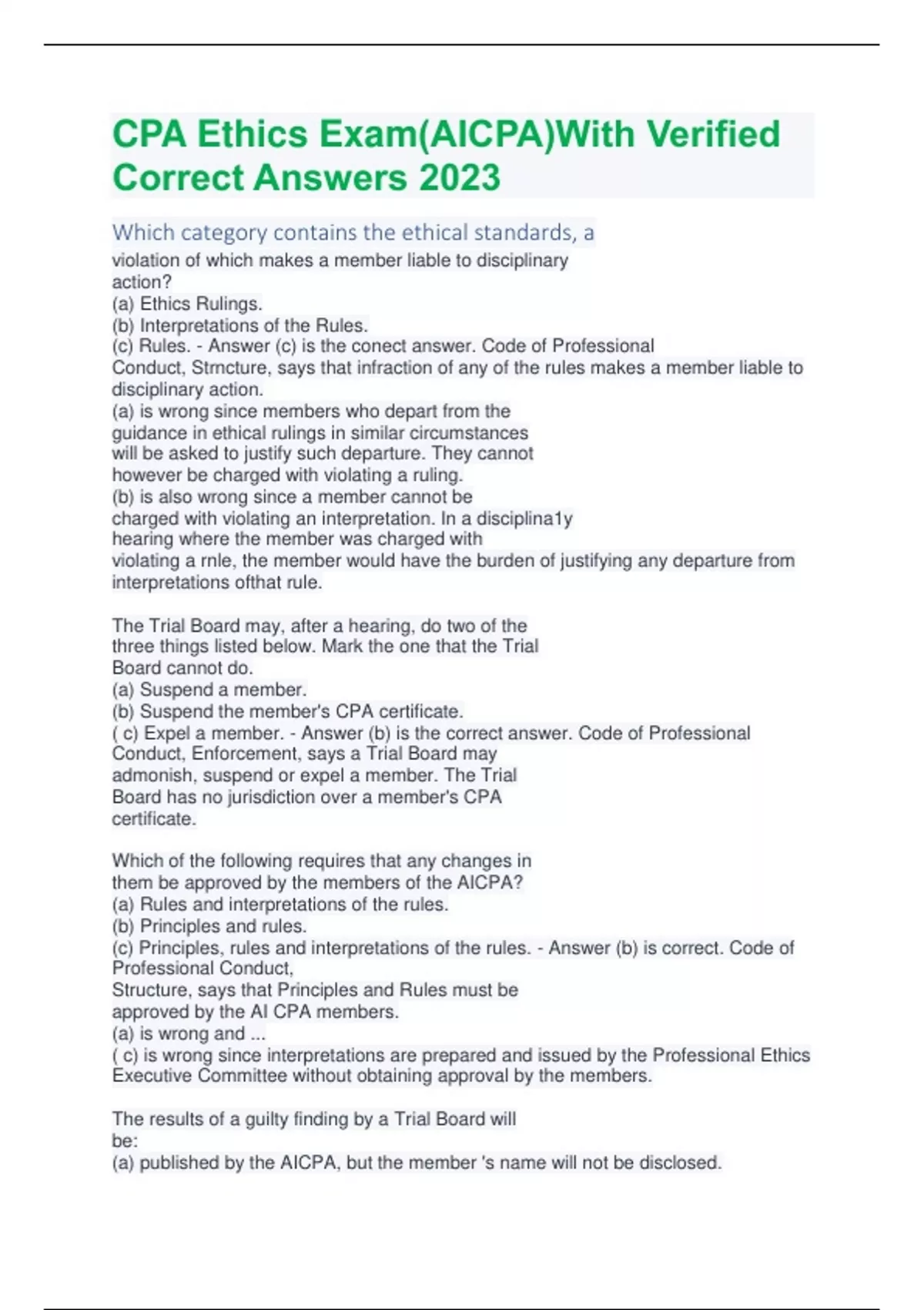 CPA Ethics Exam(AICPA)With Verified Correct Answers 2023