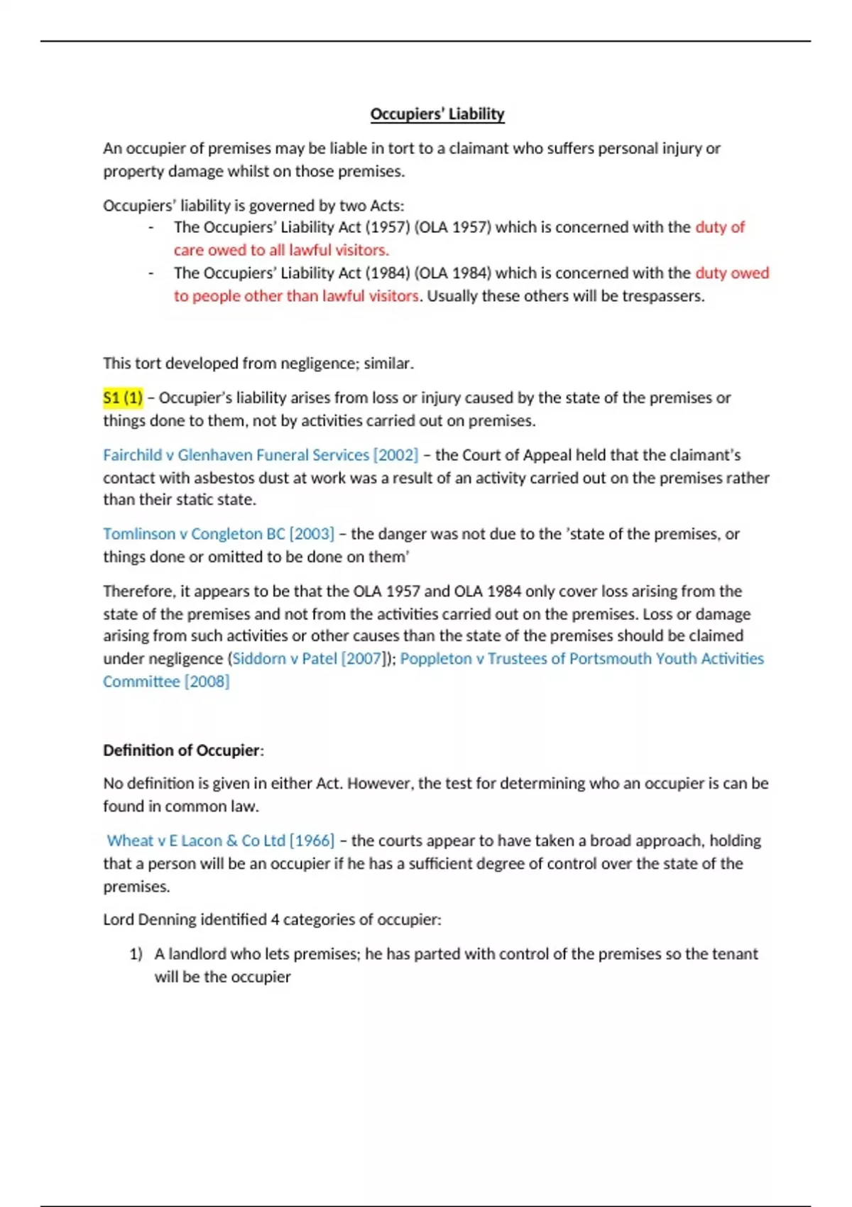 Notes on Occupier's Liability. Considers The Occupier's Liability Act 1957 and 1984. Notes on the different sections that apply. Contains brief notes on facts of case and ratio.