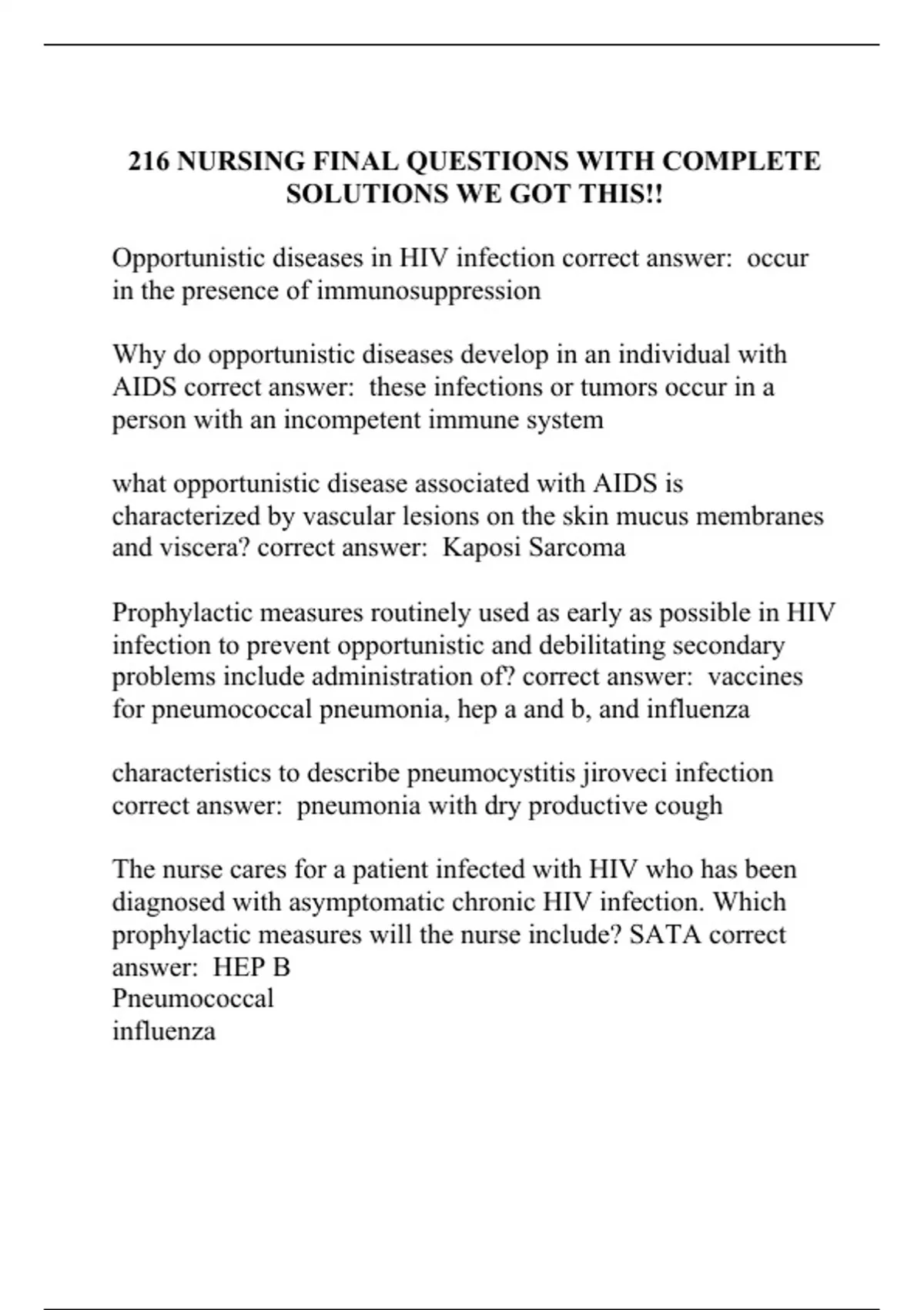 Opportunistic diseases in HIV infection correct answer: occur in the presence of immunosuppression Why do opportunistic diseases develop in an individual with AIDS correct answer: these infections or tumors occur in a person with an incompetent immune system what opportunistic disease associated with AIDS is characterized by vascular lesions on the skin mucus membranes and viscera? correct answer: Kaposi Sarcoma Prophylactic measures routinely used as early as possible in HIV infection to prevent opportunistic and debilitating secondary problems include administration of? correct answer: vaccines for pneumococcal pneumonia, hep a and b, and influenza characteristics to describe pneumocystitis jiroveci infection correct answer: pneumonia with dry productive cough The nurse cares for a patient infected with HIV who has been diagnosed with asymptomatic chronic HIV infection. Which prophylactic measures will the nurse include? SATA correct answer: HEP B Pneumococcal influenza the client diagnosed with AIDS is seen in the emergency room with complaints of mouth pain, difficulty swa