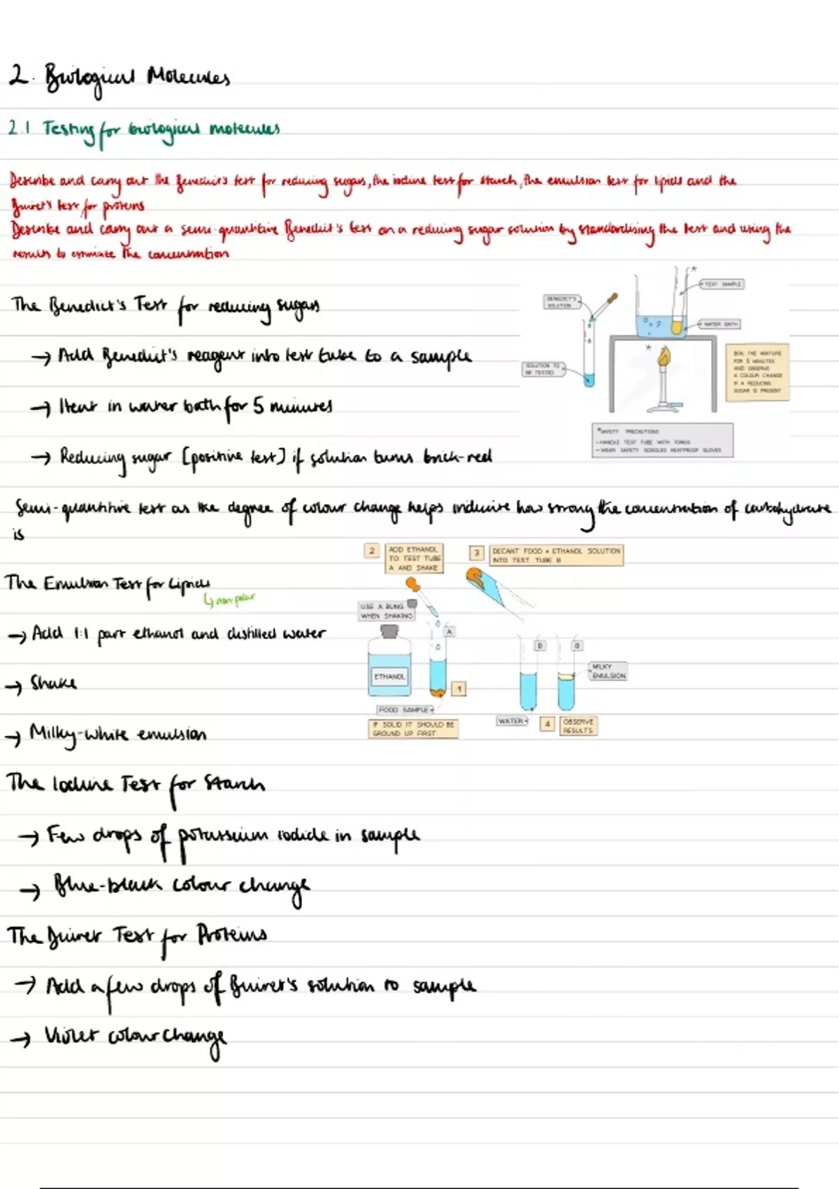 Benedict test for reducing sugars the iodine test for starch the emulsion test for lipids and the