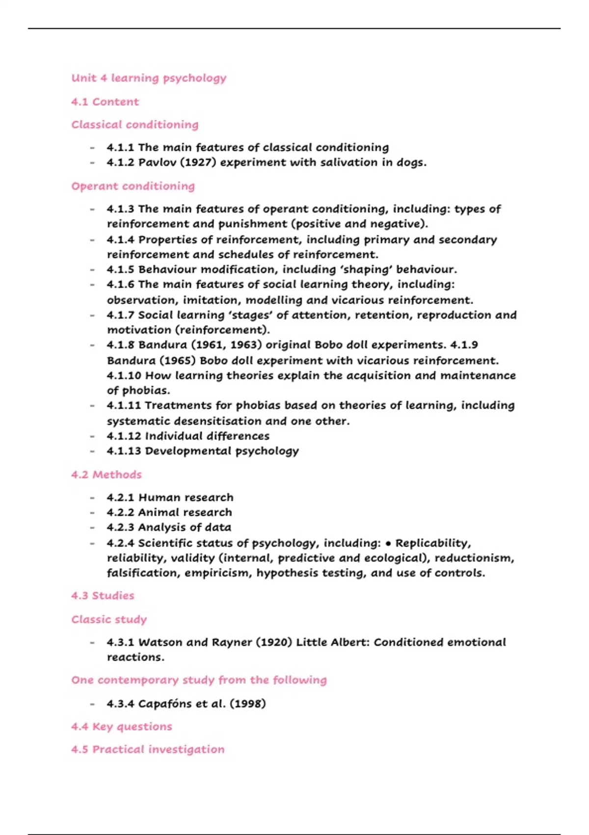 - Unit 4 Learning psychology - Summary notes 44 pages - Includes all topics from Edexcel specification (content, methods, studies, key question and practical) - Includes exam style answers as well as detailed A01 and A03