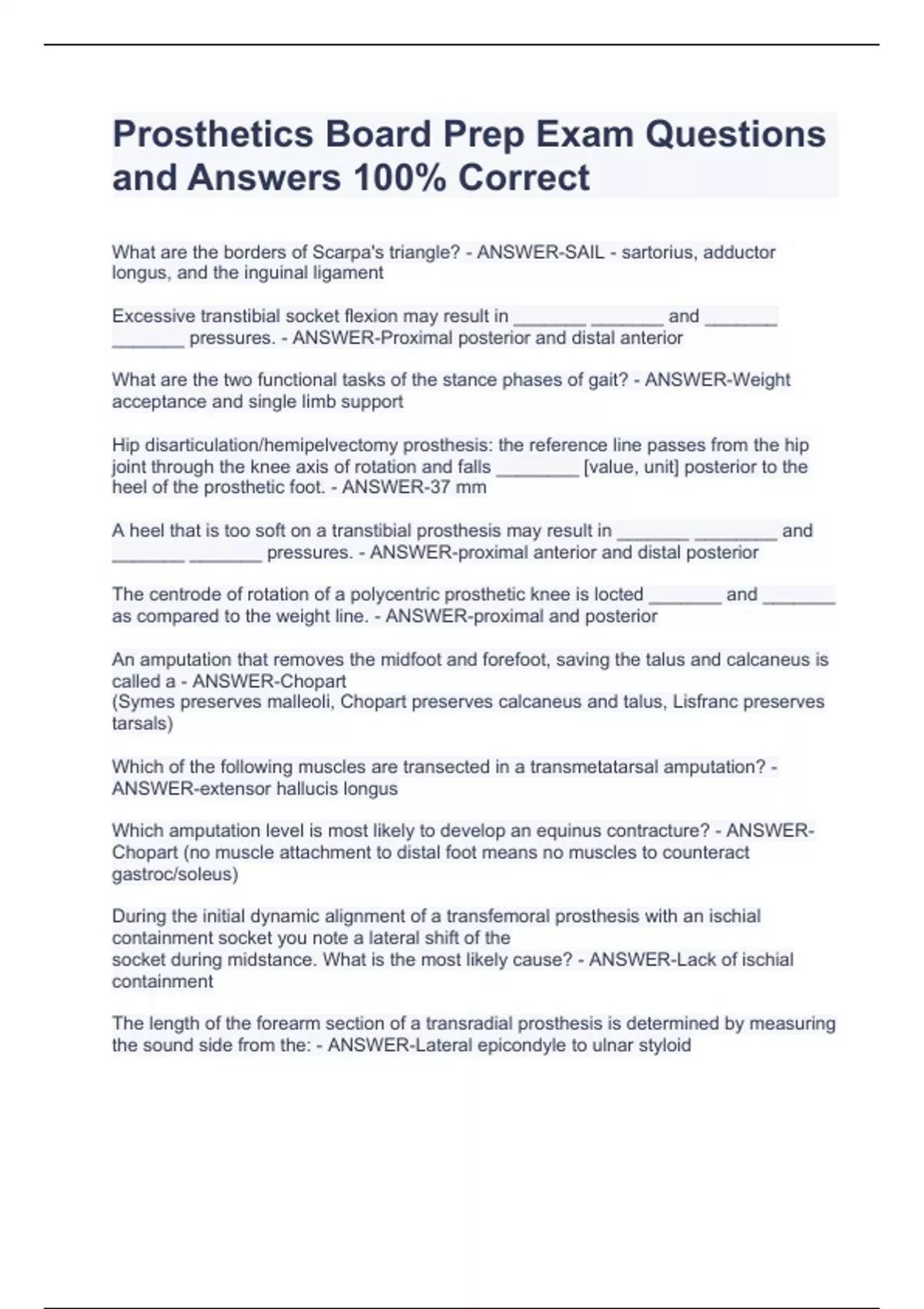 Prosthetics Board Prep Exam Questions and Answers 100% CorrectProsthetics Board Prep Exam Questions and Answers 100% CorrectProsthetics Board Prep Exam Questions and Answers 100% CorrectProsthetics Board Prep Exam Questions and Answers 100% CorrectProsthetics Board Prep Exam Questions and Answers 100% Correct What are the borders of Scarpa's triangle? - ANSWER-SAIL - sartorius, adductor longus, and the inguinal ligament Excessive transtibial socket flexion may result in _______ _______ and _______ _______ pressures. - ANSWER-Proximal posterior and distal anterior What are the two functional tasks of the stance phases of gait? - ANSWER-Weight acceptance and single limb support Hip disarticulation/hemipelvectomy prosthesis: the reference line passes from the hip joint through the knee axis of rotation and falls ________ [value, unit] posterior to the heel of the prosthetic foot. - ANSWER-37 mm A heel that is too soft on a transtibial prosthesis may result in _______ ________ and _______ _______ pressures. - ANSWER-proximal anterior and distal posterior The centrode of rotation of a polycentric prosthetic knee is locted _______ and _______ as compared to the weight line. - ANSWER-proximal and posterior An amputation that removes the midfoot and forefoot, saving the talus and calcaneus is called a - ANSWER-Chopart (Symes preserves malleoli, Chopart preserves calcaneus and talus, Lisfranc preserves tarsals) Which of the following muscles are transected in a transmetatarsal amputation? - ANSWER-extensor hallucis longus