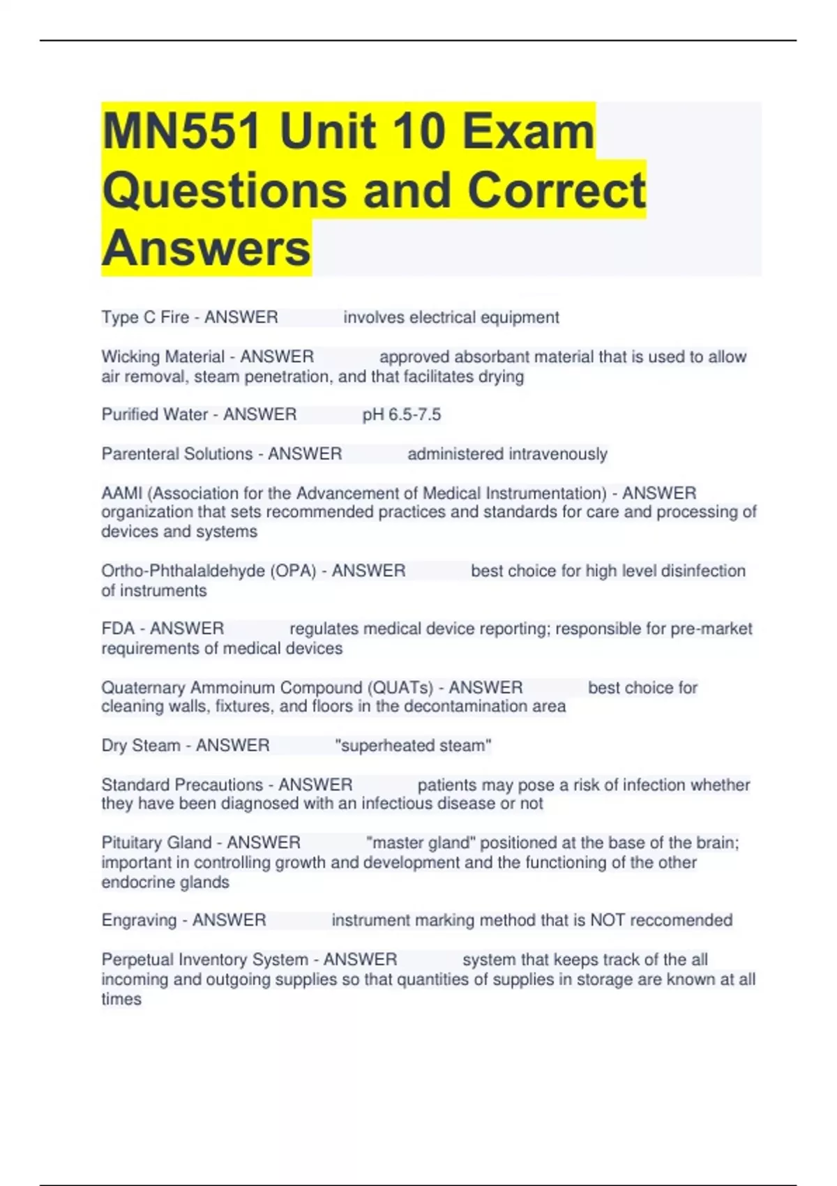 MN551 Unit 10 Exam Questions and Correct Answers Type C Fire - ANSWER involves electrical equipment Wicking Material - ANSWER approved absorbant material that is used to allow air removal, steam penetration, and that facilitates drying Purified Water - ANSWER pH 6.5-7.5 Parenteral Solutions - ANSWER administered intravenously AAMI (Association for the Advancement of Medical Instrumentation) - ANSWER organization that sets recommended practices and standards for care and processing of devices and systems Ortho-Phthalaldehyde (OPA) - ANSWER best choice for high level disinfection of instruments FDA - ANSWER regulates medical device reporting; responsible for pre-market requirements of medical devices Quaternary Ammoinum Compound (QUATs) - ANSWER best choice for cleaning walls, fixtures, and floors in the decontamination area Dry Steam - ANSWER "superheated steam" Standard Precautions - ANSWER patients may pose a risk of infection whether they have been diagnosed with an infectious disease or not Pituitary Gland - ANSWER "master gland" positioned at the base of the brain; important in controlling growth and development and the functioning of the other endocrine glands Engraving - ANSWER instrument marking method that is NOT reccomended Perpetual Inventory System - ANSWER system that keeps track of the all incoming and outgoing supplies so that quantities of supplies in storage are known at all times