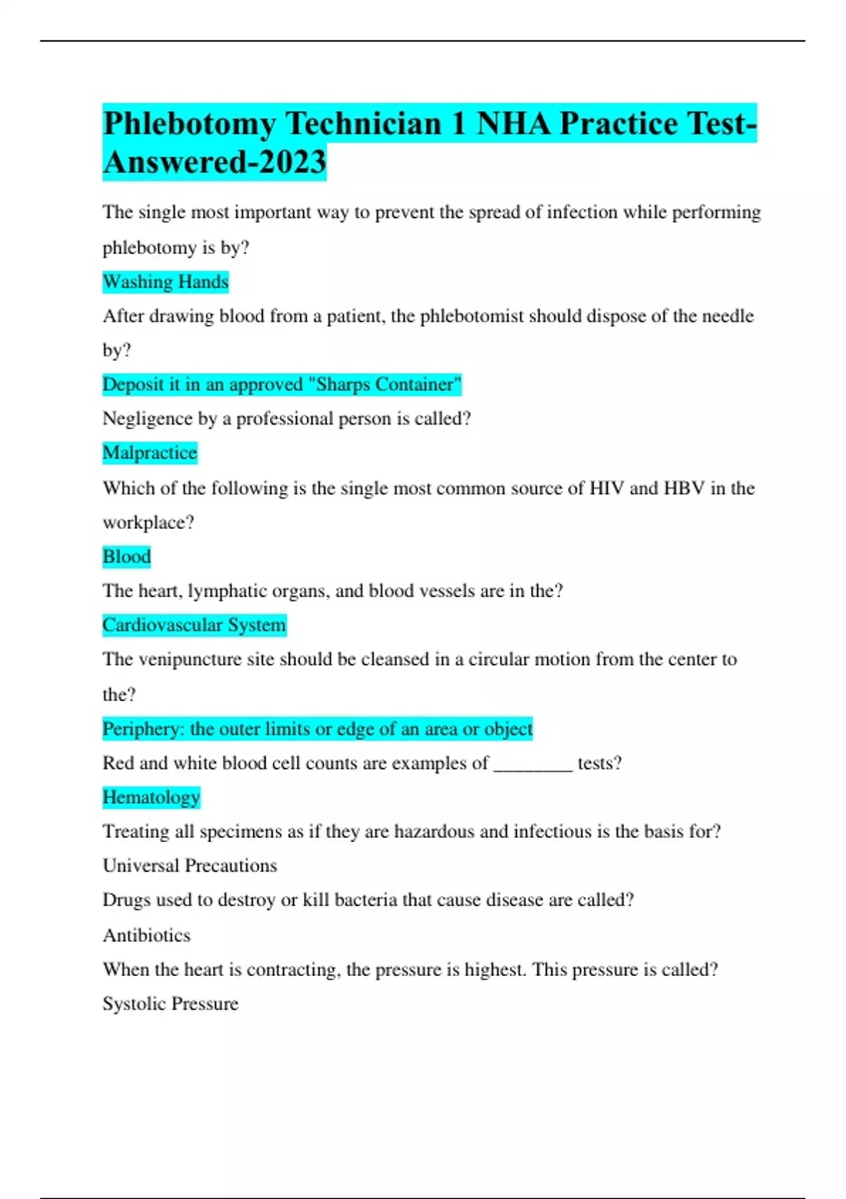 Phlebotomy Technician 1 NHA Practice Test-Answered-100% Verified-2023 The single most important way to prevent the spread of infection while performing phlebotomy is by? Washing Hands After drawing blood from a patient, the phlebotomist should dispose of the needle by? Deposit it in an approved "Sharps Container" Negligence by a professional person is called? Malpractice Which of the following is the single most common source of HIV and HBV in the workplace? Blood The heart, lymphatic organs, and blood vessels are in the? Cardiovascular System The venipuncture site should be cleansed in a circular motion from the center to the? Periphery: the outer limits or edge of an area or object Red and white blood cell counts are examples of ________ tests? Hematology Treating all specimens as if they are hazardous and infectious is the basis for? Universal Precautions Drugs used to destroy or kill bacteria that cause disease are called? Antibiotics When the heart is contracting, the pressure is highest. This pressure is called? Systolic Pressure The process by which an object or area becomes unclean is known as? Contamination The health worker is protected by law if it can be determined that he or she acted as expected when compared with fellow workers. This is called? Reasonable Care Characteristics of capillaries include? Being thin walled in structure Forming microscopic pathways Connecting arterioles with venules ALL OF THE ABOVE The branch of study of moral issues, questions and problems arising in the practice of medicine and in biomedical research is called? Bioethics If a test requires serum rather than plasma, a tube with what color top should be drawn? Red When using evacuated tubes for blood collection, it is crucial to remember to? Never under fill tubes that contain anticoagulant Never use tubes past their stated expiration dates Immediately invert any tubes that contain additives ALL OF THE ABOVE The rubber sleeve (at the end opposite the needle tip) on an evacuated tube needle makes it possible for use with? Multiple Tubes Capillary blood sampling may be used if the laboratory tests require? Very little blood The tube to collect whole blood with an EDTA additive in it has a _________________ stopper? Lavender Diastolic pressure is? The bottom number of blood pressure readings Do not draw ________________ an intravenous infusion? Above Which of the following legally enforces the Bloodbourne Pathogen Standard? OSHA Common symptoms of shock include all of the following EXCEPT? Temperature Which of the following causes AIDS? HIV Arterioles, the smallest arteries, subdivide into? Capillaries Which is the best method for a phlebotomy technician to collect blood specimen from an older adult patient who has fragile, easy-to-collapse veins? Choose a syringe and butterfly assembly and transfer to an ETS tube: a syringe minimizes pressure on fragile veins and helps prevent collapsing A phlebotomy technician is preparing a blood specimen from a patient for an erythrocyte sedimentation rate (ESR) test. The technician should select a collection tube that has a top with which of the following colors? Lavender: should be used when collecting for an erythrocyte sedimentation rate test (ESR) A phlebotomy technician is reviewing a laboratory requisition before obtaining blood specimens from a patient. The technician should verify that the requisition includes which of the following information? A specimen identification code: A unique specimen ID code Patients full name Patients DOB A phlebotomy technician should use a capillary collection instead of a venipuncture in which of the following situations? A patients veins are inaccessible: due to IV's, scaring, or burns A phlebotomy technician is preparing to collect a patients troponin T level. Which of the following troponin T levels should the technician immediately report to the provider? 0.3 ng/ml: 0.3 ng/ml is above the expected reference range of 0 to 0.2 ng/ml and is therefore a critical value A phlebotomy technician is preparing to collect a blood specimen from a patient who is allergic to alcohol. Which of the following antiseptic solutions should the technician use to prepare the insertion site? Chlorhexidine: alternative antiseptic solution for patients who have allergies to alcohol or latex A phlebotomy technician is using a glucose monitor for point-of-care testing of a patient who has been fasting for 12 hrs. For which of the following results should the technician immediately notify the provider? 130 mg/dl: fasting blood glucose of 130 mg/dl is above the expected reference range of 70 to 110 mg/dl A phlebotomy technician should identify that which of the following is an identifier for a specimen as long as it remains in the laboratory? Accession Number: identifies a specimen as long as it remains in the laboratory A phlebotomy technician is reviewing a laboratory test requisition form before obtaining blood specimens for a patient. Which of the following actions should the technician take prior to performing the venipuncture? Check the requisition form for the duplicate test orders: discrepancies and missing information prior to performing the venipuncture A phlebotomy technician should identify that which of the following is the first step in the blood collection procedure? Test Requisition: ensure you have the provider's order for a test before preforming a blood collection An unconscious patient is brought to the emergency department, and several blood tests are ordered. A phlebotomy technician should collect the patients blood because he has received which of the following types of consent? IMPLIED Consent: implied consent can be obtained when a patient is unconscious and in an emergency situation A phlebotomy technician is collecting capillary blood drops on a filter paper card to screen a newborn for phenylketonuria. Which of the following actions should the technician take? Apply blood to the printed side of the filter paper: only 