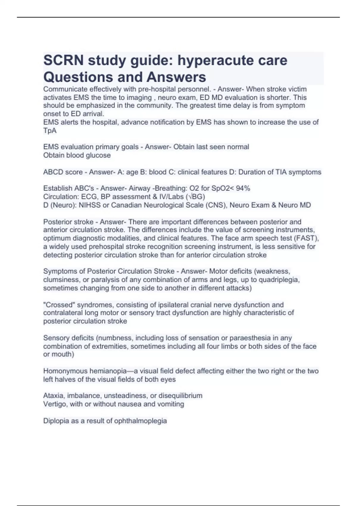 scrn study guide hyperacute care questions and an
