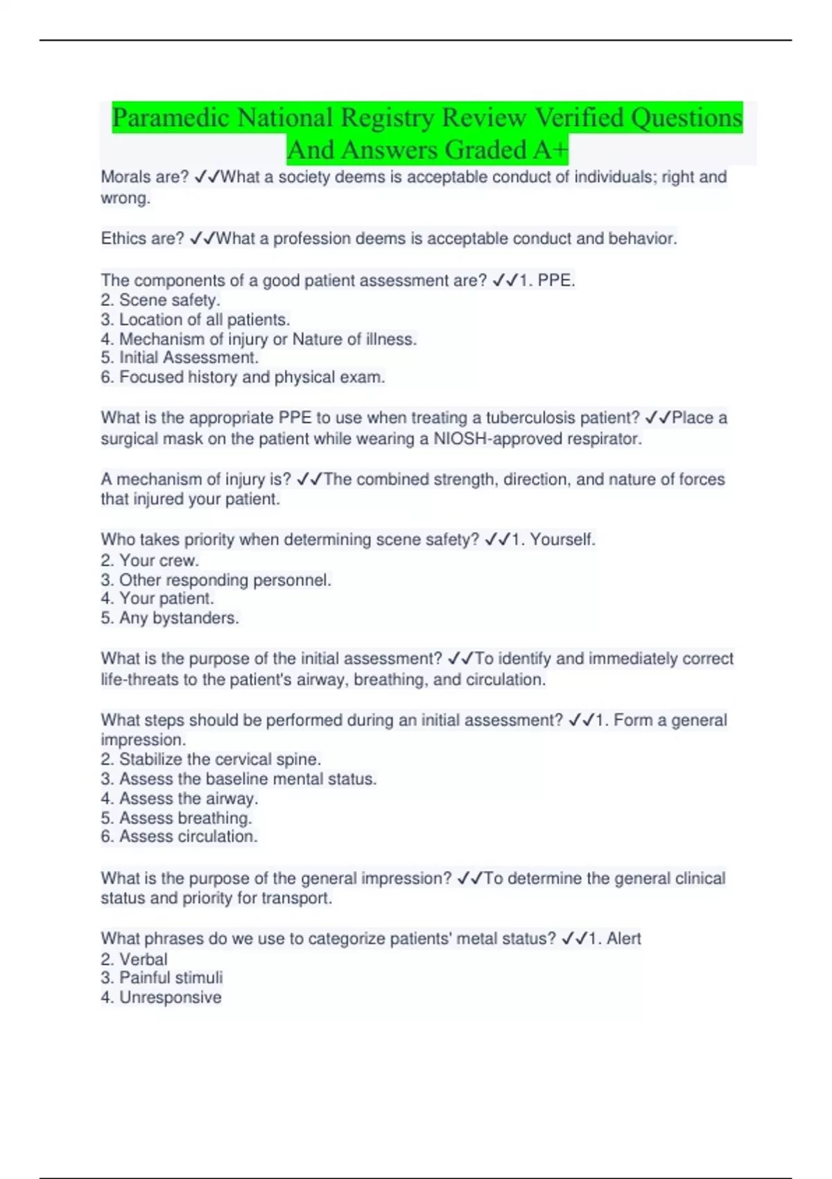 Paramedic National Registry Review Verified Questions And Answers Graded A+ Morals are? What a society deems is acceptable conduct of individuals; right and wrong. Ethics are? What a profession deems is acceptable conduct and behavior. The components of a good patient assessment are? 1. PPE. 2. Scene safety. 3. Location of all patients. 4. Mechanism of injury or Nature of illness. 5. Initial Assessment. 6. Focused history and physical exam. What is the appropriate PPE to use when treating a tuberculosis patient? Place a surgical mask on the patient while wearing a NIOSH-approved respirator.