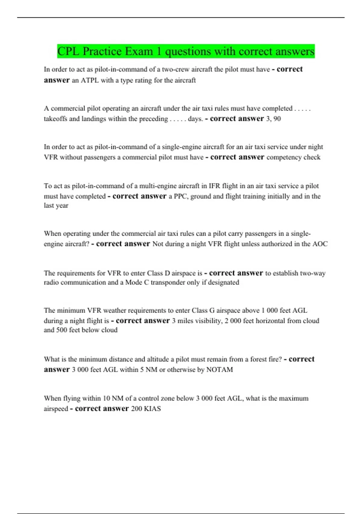 cpl practice exam 1 questions with correct answers