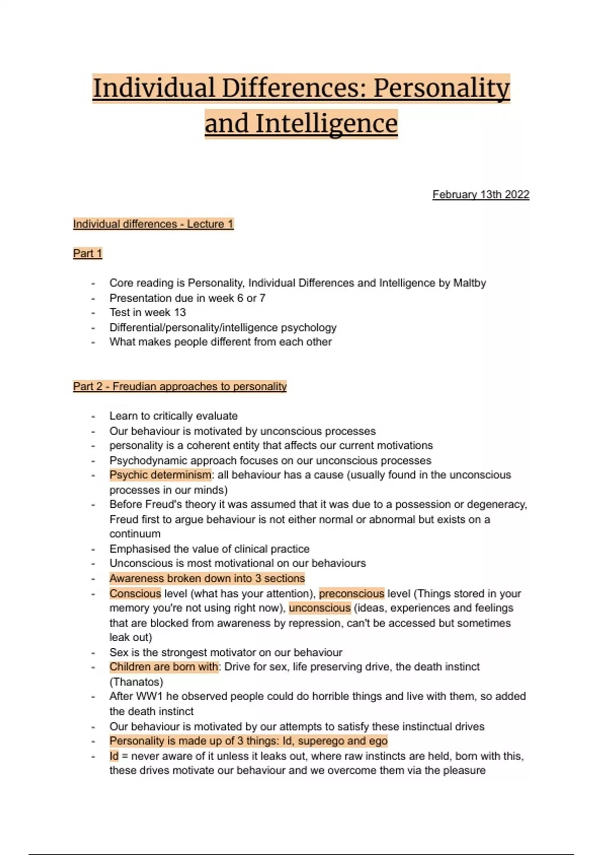 Full typed lecture notes for the Individual Differences: Personality and Intelligence module studied in year one of Psychology. The notes are bullet-pointed for easy reading and each keyword and heading is highlighted in blue, making information quick and simple to find.