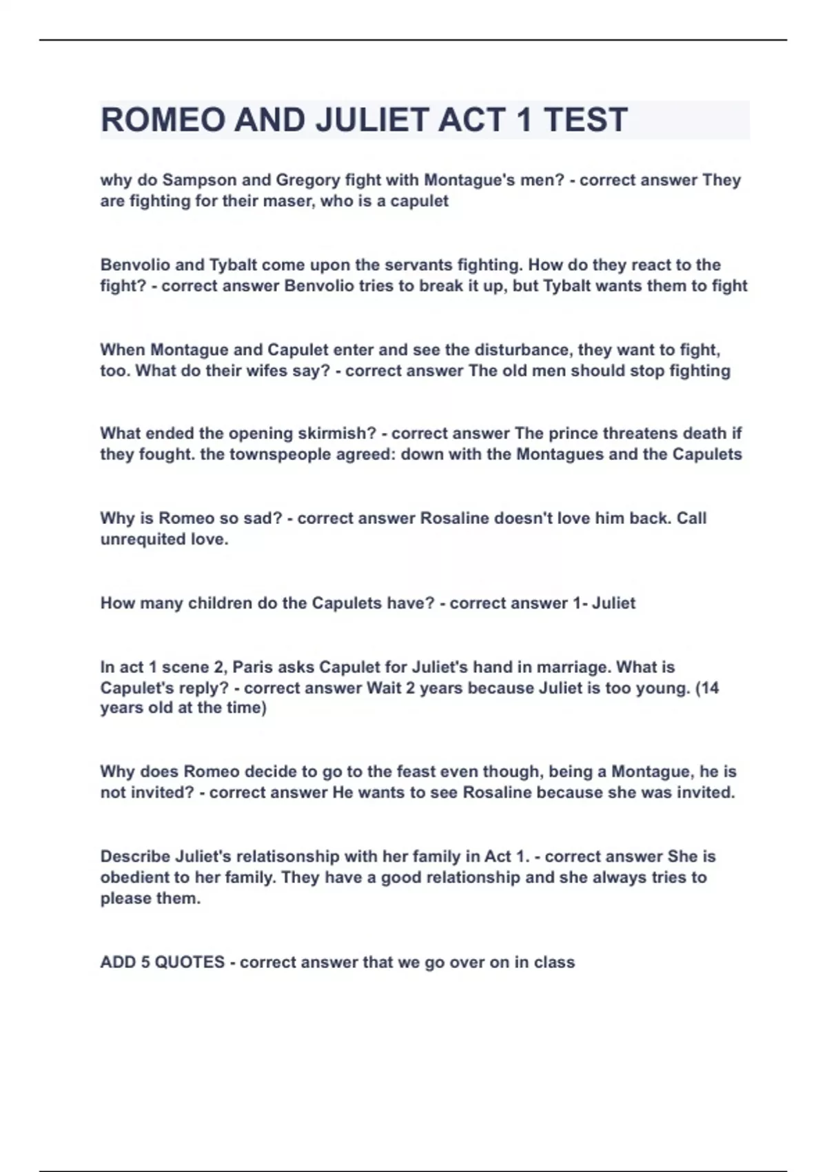 ROMEO AND JULIET ACT 1 TEST|UPDATED&VERIFIED|100% SOLVED|GUARANTEED SUCCESS