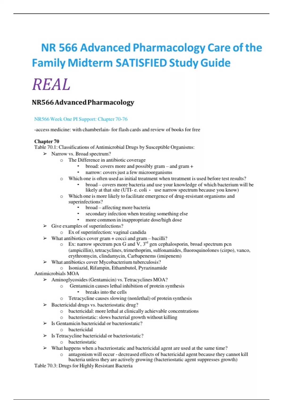 NR 566 Advanced Pharmacology Care of the Family Midterm SATISFIED Study Guide REAL NR566 Advanced Pharmacology NR566 Week One PI Support: Chapter 70-76 -access medicine: with chamberlain- for flash cards and review of books for free Chapter 70 Table 70.1: Classifications of Antimicrobial Drugs by Susceptible Organisms: Narrow vs. Broad spectrum? o The Difference in antibiotic coverage ▪ broad: covers more and possibly gram – and gram + ▪ narrow: covers just a few microorganisms o Which one is often used as initial treatment when treatment is used before test results? ▪ broad – covers more bacteria and use your knowledge of which bacterium will be likely at that site (UTI- e. coli use narrow spectrum because you know) o Which one is more likely to facilitate emergence of drug-resistant organisms and superinfections? ▪ broad – affecting more bacteria ▪ secondary infection when treating something else ▪ more common in inappropriate dose/high dose Give examples of superinfections? o Ex of superinfection: vaginal candida What antibiotics cover gram + cocci and gram – bacilli? o Ex: narrow spectrum pcn G and V, 3rd gen cephalosporin, broad spectrum pcn (ampicillin), tetracyclines, trimethoprim, sulfonamides, fluoroquinolones (cirpo), vanco, erythromycin, clindamycin, Carbapenems (imipenem) What antibiotics cover Mycobacterium tuberculosis? o Isoniazid, Rifampin, Ethambutol, Pyrazinamide Antimicrobials MOA Aminoglycosides (Gentamicin) vs. Tetracyclines MOA? o Gentamicin causes lethal inhibition of protein synthesis ▪ breaks into the cells o Tetracycline causes slowing (nonlethal) of protein synthesis Bactericidal drugs vs. bacteriostatic drug? o bactericidal: more lethal at clinically achievable concentrations o bacteriostatic: slows bacterial growth without killing Is Gentamicin bactericidal or bacteriostatic? o bactericidal Is Tetracycline bactericidal or bacteriostatic? o bacteriostatic What happens when a bacteriostatic and bactericidal agent are used at the same time? o antagonism will occur - decreased effects of bactericidal agent because they cannot kill bacteria unless they are actively growing (bacteriostatic agent suppresses growth) Table 70.3: Drugs for Highly Resistant Bacteria Microbes have 4 basic mechanisms for resisting drugs: o reduction of drug concentration at its site of action o alteration of drug target molecules o antagonist production o drug activation What antibiotic has resistance to C. diff? o metronidazole What antibiotic choices are there to treat C. diff? o vanco. rifaximin o vanco ORAL (needs to go to site where growth is – gut) Mechanisms by which resistance is acquired 1. Spontaneous mutation 2. conjugation (acquisition of DNA R-factors from one bacterium to next- often gram- bacteria and normal flora) Can antibiotics promote overgrowth of normal flora? o yes- if they are resistant Normal flora can transfer resistance to pathogens o Guess # patients who end up with health-care associated infections ▪ 1/20-5% ▪ This is problematic if antibiotics are overused when not needed, risk is it may not work when needed (ie. for HAI) Common Infections and Treatment (Table 70.4-70.5) What are the 4 main kind of bacteria found in community acquired pneumonia (CAP): o streptococcus pneumonae o mycoplasma pneumonae o H influenzae o staphylococcus aureus Main bacteria found in CAP? streptococcus pneumonae (adults) 2 most common bacteria found in UTI? e. coli and Enterobacteriaceae What abx is 1st choice for uncomplicated gram + UTI? amoxicillin What alt abx is used in UTI cipro resistant caused by pseudomonas aeruginosa gram-? levofloxacin, piperacillin-tazobactam (Zosyn), ceftazidime, cefepime, meropenem, gentamicin, tobramycin, aztreonam What abxs is used to treat meningitis? Cefotaxime, ceftriaxone, cephalosporin What abx if used to treat upper resp infection (URI) or bronchitis (bacterial, most are viral)? Bactrim Alternative abx for H. pylori (1st treatment ineffective or allergy)? tetracycline + metronidazole + subsalicylate + Protonix Empiric Antibiotic Therapy and Tests First rule: Match the drug with the bug Determine drug susceptibility if resistance is common (checking for C. diff; strep sensitivity never done why tho?) What is the quickest, simplest way to ID microorganisms? gram stain to visualize under microscope What test can detect very low titers of bacteria/viruses? PCR o PCR can detect bacterial pathogens of C. diff, S. aureus, mycobacterium tuberculosis, Neisseria gonorrhoeae, chlamydia trachomatis, and H. pylori What viral pathogens can be detected by PCR? HIV and influenza virus Host Factors Affect Rx Host defenses (immune system and phagocytic cells) Site of infection (need adequate MIC- the amt of abx at the site of infection in a concentration > than that to be effective) o how much drug levels at a site to be effective? 4-8x MIC Why is minimum inhibitory concentration (MIC) important with abx? What are some foreign (medical) materials in body that phagocytes attempt to destroy? cardiac pacemakers, shuts, heart valves, prostatic joints Previous allergic reactions to Rx and generic factors (avoid giving abx that break RBCs in patients with G6PD deficiency and do not give isoniazid to slow metabolizers (Asians?) as toxic accumulation may occur) Reason: abx pass thru milk – sulfonamide can cause kernicterus (neuro damage) What: heightened drug sensitivity, greater levels = toxic levels Chapter 71: Drugs that Weaken the Bacterial Cell Wall I Beta-Lactams: Penicillin Widely prescribed d/t safety and efficacy as NO direct effects on cells of the host (host cells do not have walls, but bacterial cells do have cell walls) PCNs weaken cells walls, which allows water to enter and eventually bursts cell So are they bactericidal or bacteriostatic? Inhibit transpeptidases and activated autolysins by binding to those enzymes (PCP) Mechanisms of Bacterial Resistance to PCN Inability of PCN to reach their targets (PBP) o Gram- bacteria wa